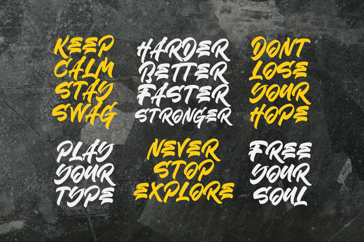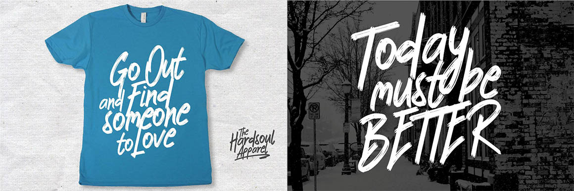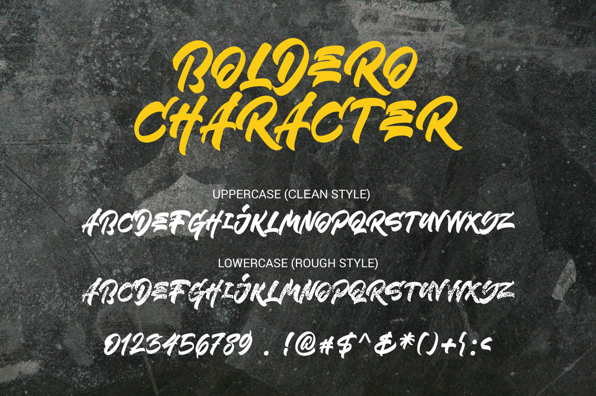 Boldero Brush font inspired by graffiti art. It is based on irregular scratches from a brush pen. Normally a brushpen will produce a beautiful calligraphy, so we tried to create an anti-mainstream style that we call calligraffiti. Boldero Brush is a display font. So it is more suitable for making a poster design , promo materials, banners, t-shirts or a design that would like to display the courage of expression. Boldero Brush not bring lowercase, instead we make a rough style to create a vintage design and more personalized.