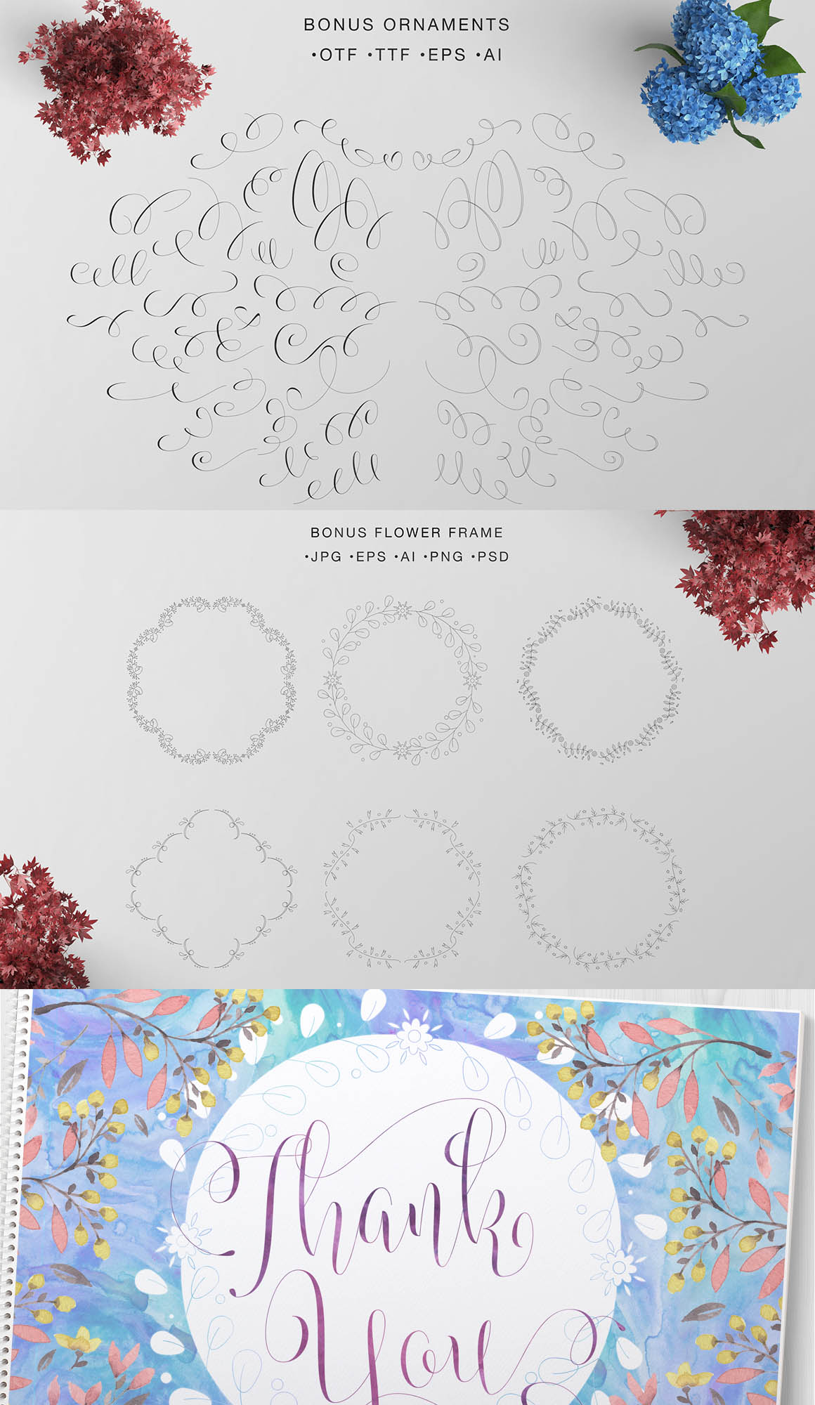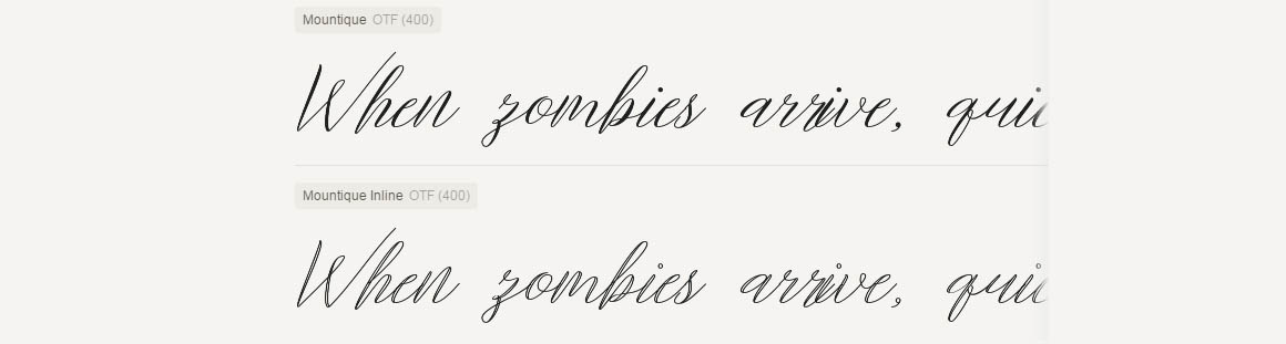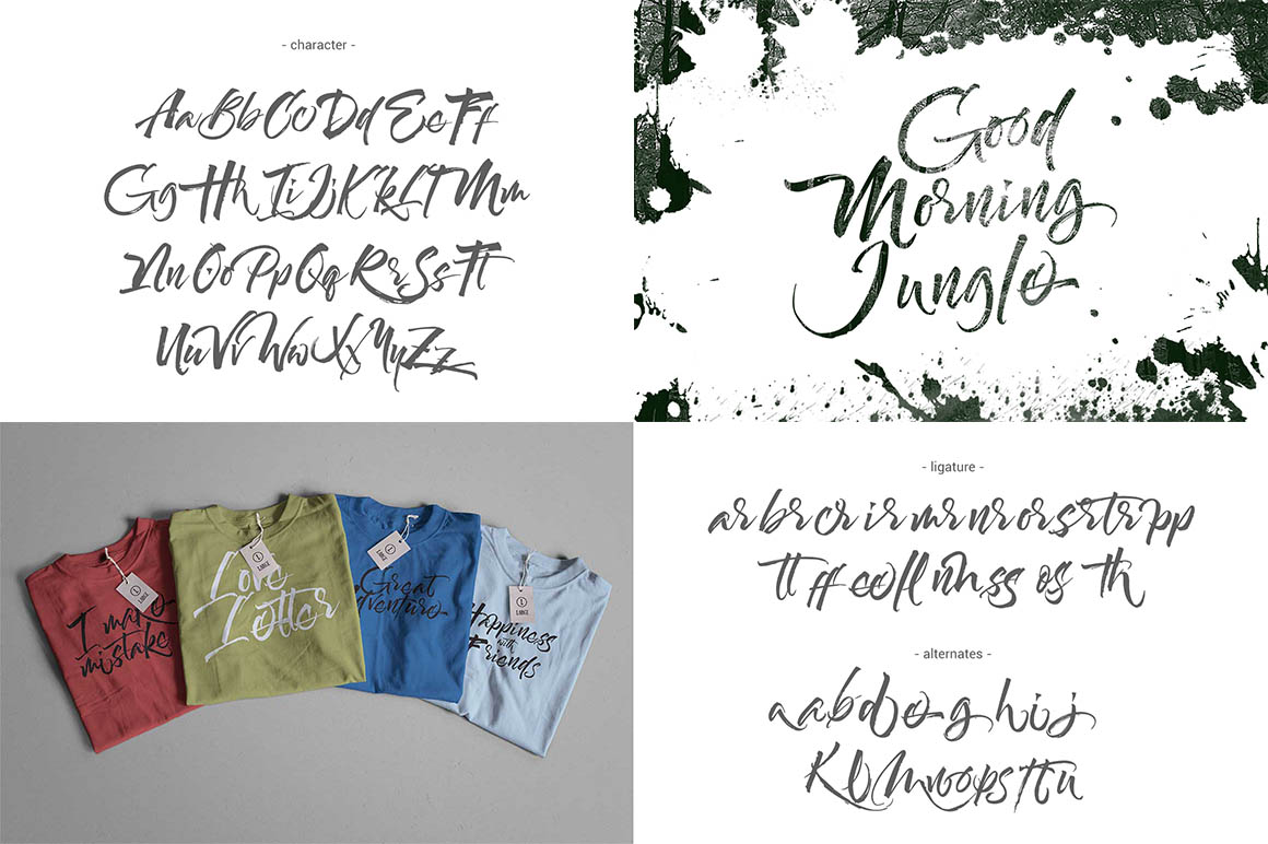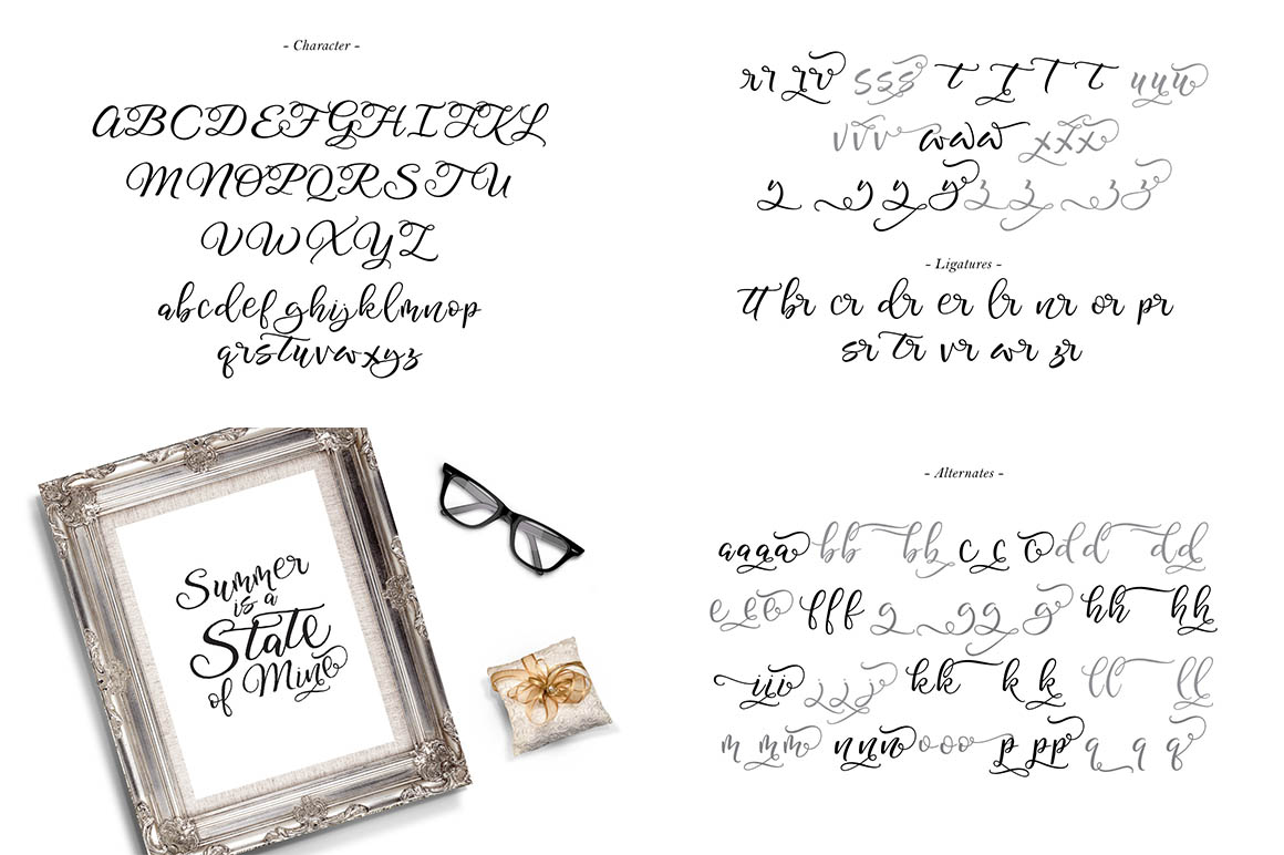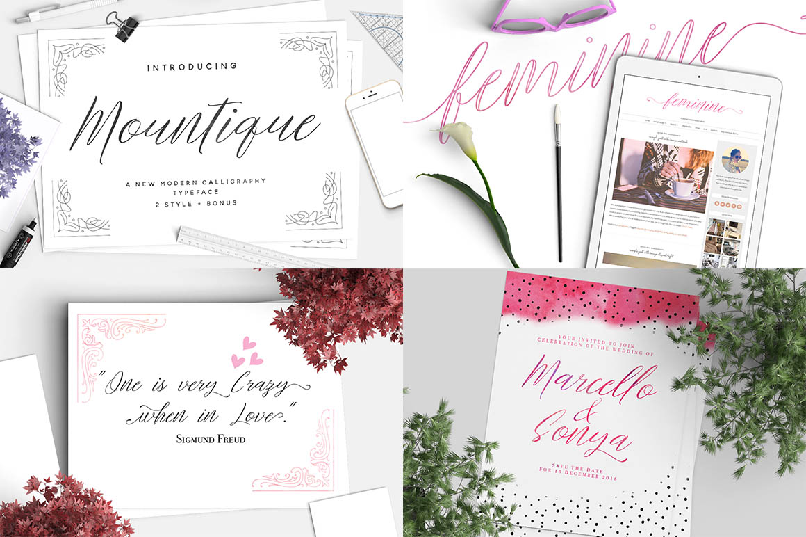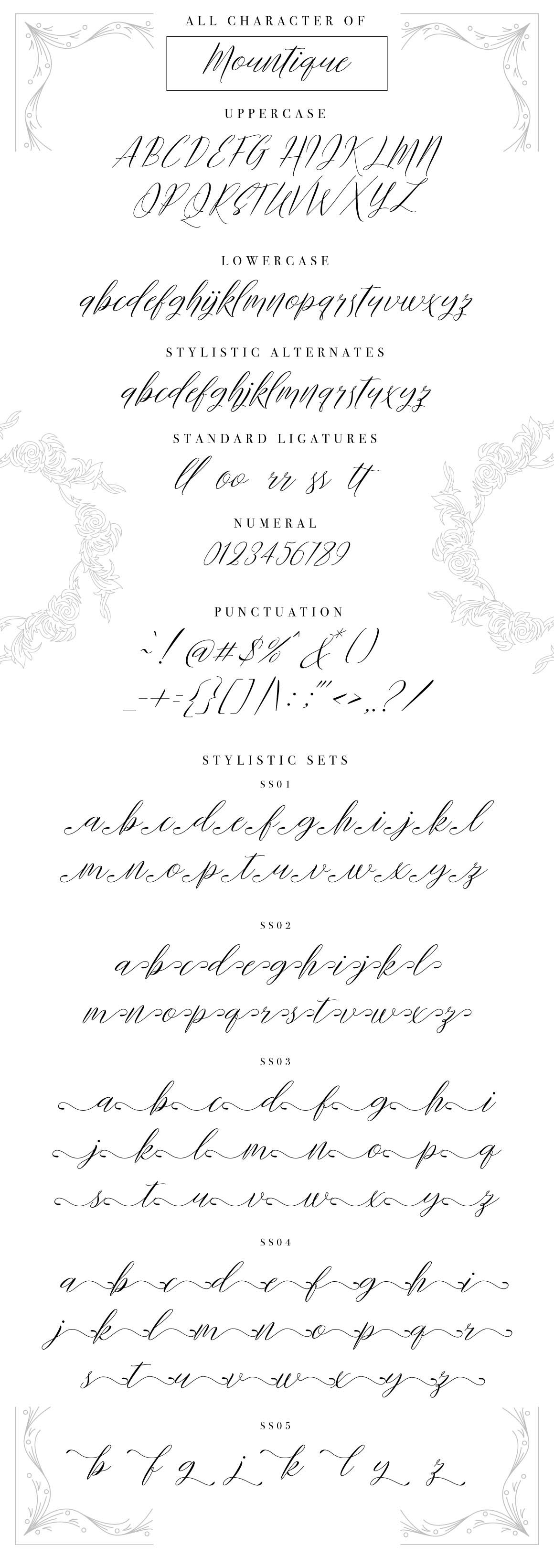 Mountique Script Typeface Two Style is a new Modern Calligraphy Typeface Fonts collection from Ianmikraz studio, combines from copperplate to contemporary typeface, classic, beauty and elegant touch. Mountique Script Typeface Two Style features 311 glyphs and 137 alternate character contain with opentype features and has given PUA unicode (specially coded fonts), with tons of alternate characters. . Stylistic Alternates, Standart Ligature and more.You can access all those alternate characters by using OpenType savvy programs such as Adobe Illustrator, Adobe InDesign and CorelDraw X6-X7. For other programs that doesn’t support OpenType Features or Glyphs Panel such as Photoshop, you can use Character Map in Windows to access the alternate characters 🙂