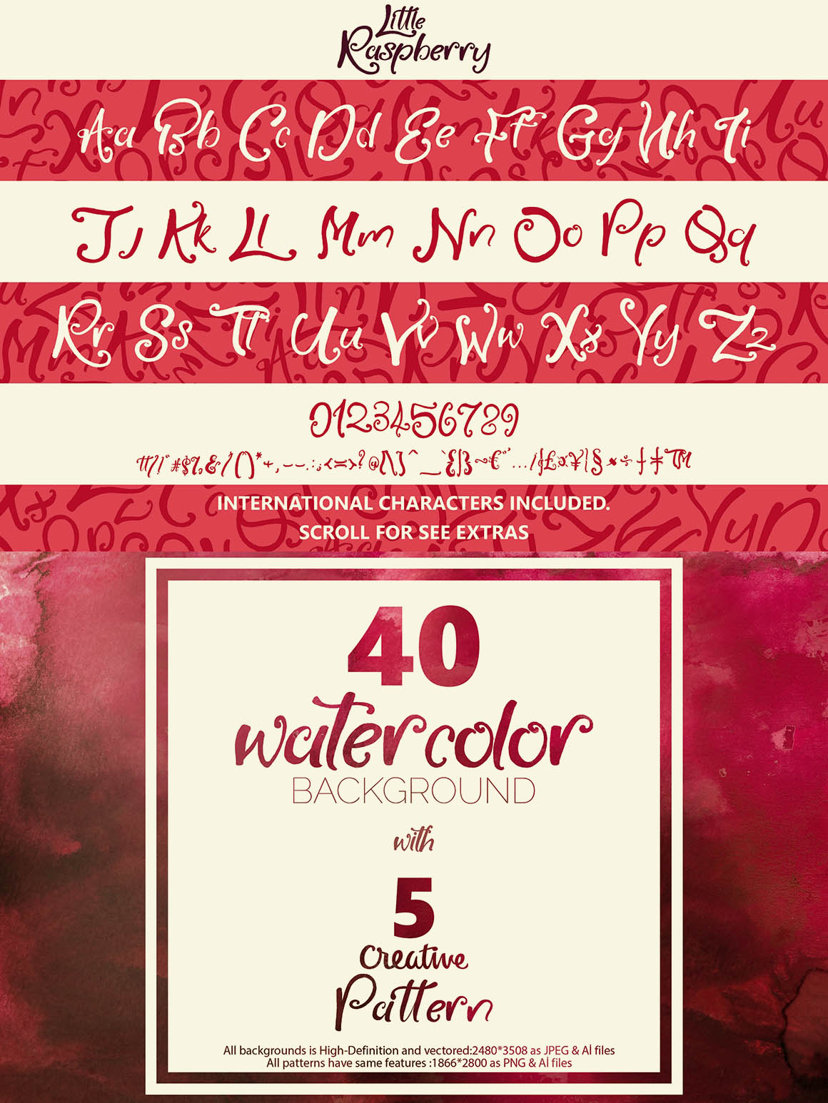 Little Raspberry Typeface+Extras , this delicious font is the new member of our family. You see a lot of fonts around and a suprise is always needed. Little Raspberry is here to help you in your desings. Everything is unlimited here, only limit is your imagination. To desing anything you want and give them a cute mood, this file is avaiable.Beutiful book covers, posters, product labes, birthday and celebiration cards, phone cases, typograhic things and more…