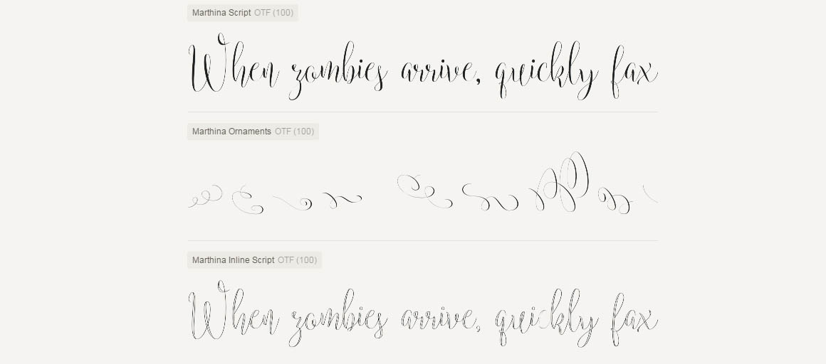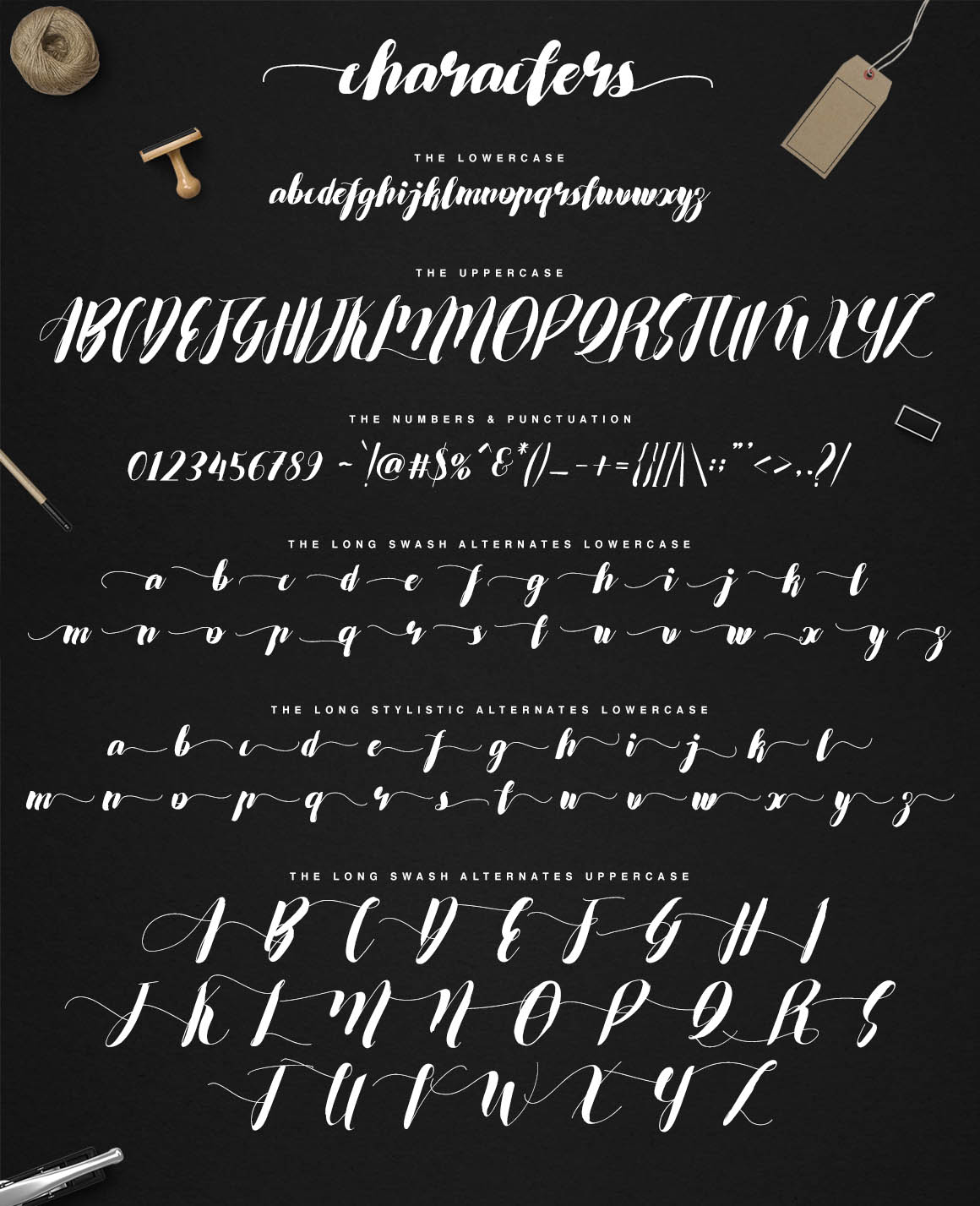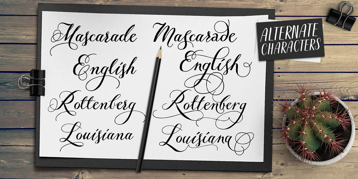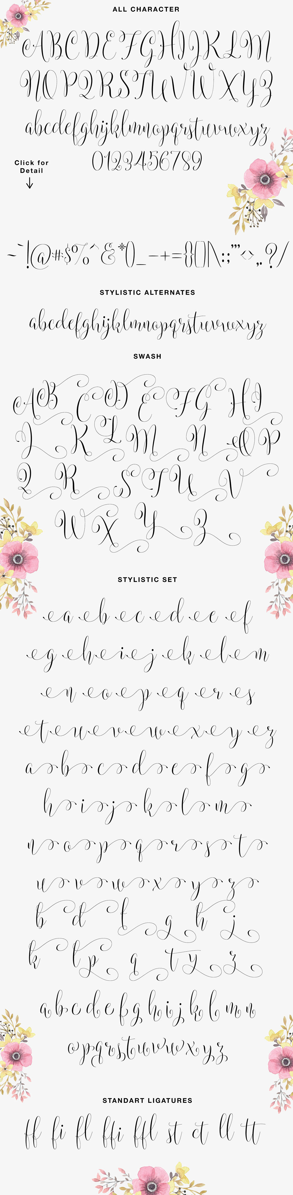 Marthina Script Two Style is a new Modern Calligraphy Typeface Fonts collection from Ianmikraz studio, combines from copperplate to contemporary typeface, classic, beauty and elegant touch. Marthina Script Two Style features 377 glyphs and 152 alternate character contain with opentype features and has given PUA unicode (specially coded fonts), with tons of alternate characters. . Stylistic Alternates, Standart Ligature and more.You can access all those alternate characters by using OpenType savvy programs such as Adobe Illustrator, Adobe InDesign and CorelDraw X6-X7. For other programs that doesn’t support OpenType Features or Glyphs Panel such as Photoshop, you can use Character Map in Windows to access the alternate characters 🙂