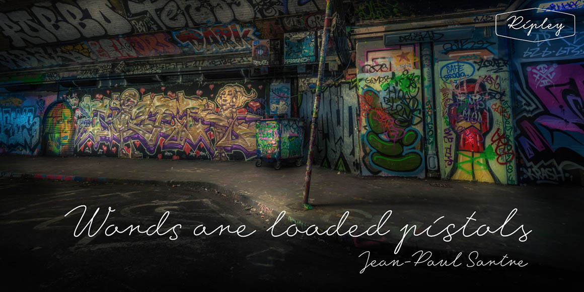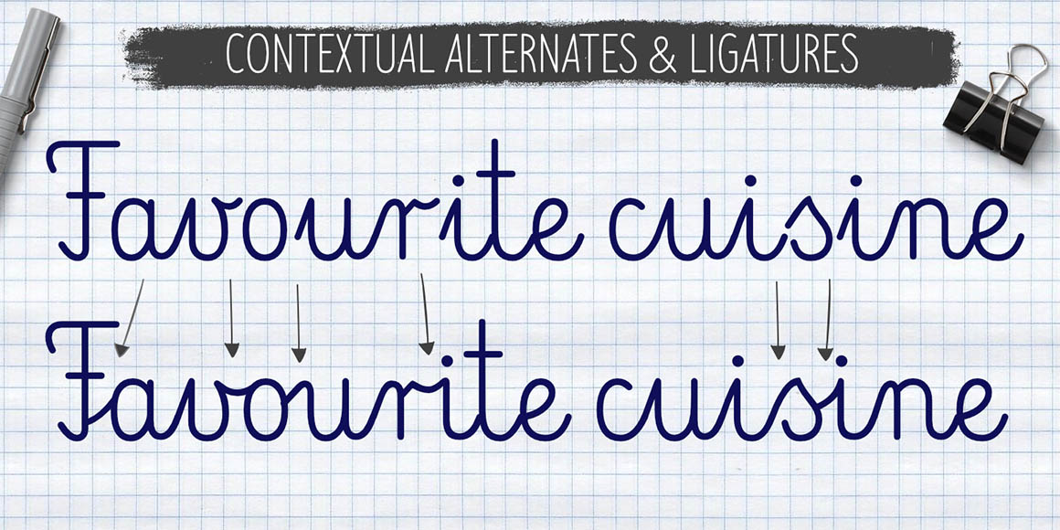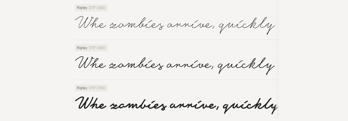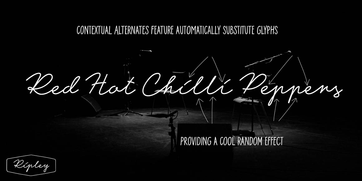 Ripley is a handwritten fully connected script with ligatures and contextual alternates to help with flow and readability. Every lowercase letter has three variations. When the font is used in OpenType-savvy applications, the 3 variants of glyphs are automatically alternated to achieve a random-like effect. Language support includes Western, Central and Eastern European character sets, as well as Baltic and Turkish languages.