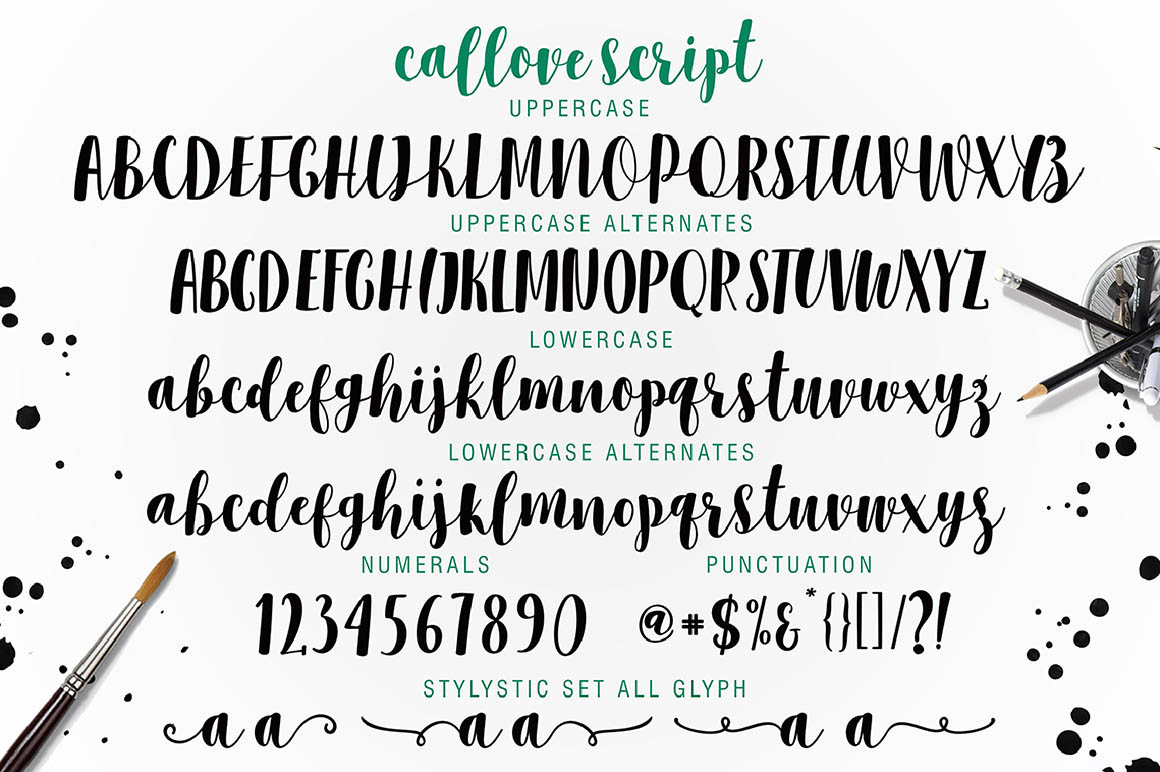 Introducing the latest styles callove script with the kind of modern hand scratches, I hope you are interested in this font, if you want to use for your work this font can be used easily and simply because there are a lot of features in it to contain a complete set of letters lower and uppercase letters, assorted punctuation, numbers, and multilingual support. font also contains alternate style Stylistic Sets, Swsh for those of you who have software that is able to work OpenType (Photoshop / Illustrator / InDesign).