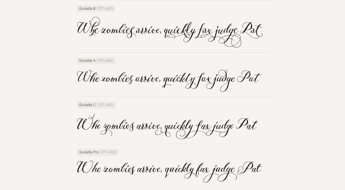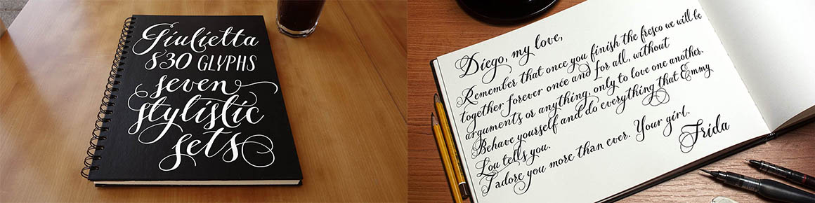 Giulietta is a handwritten, fully connected script with ligatures and contextual alternates to help with flow and readability. It can be used for invitations, greeting cards, posters, advertising, weddings, books, menus etc. Giulietta pro is the most complete style, it contains over 830 glyphs, 7 stylistic sets, contextual alternates and ligatures. Every lowercase letter has seven variations (uppercase letter has three). To get the alternate glyphs choose various stylistic sets or just add “1″, “2″, “3″, “4″, “5″,”6″ or “*7” before the letter in any OpenType savvy application or manually select the characters from Glyph Palette. Giulietta A, Giulietta B and Giulietta C have less glyphs than the Pro one, they only contain some selected alternates and ligatures. Language support includes Western, Central and Eastern European character sets, as well as Baltic and Turkish languages.