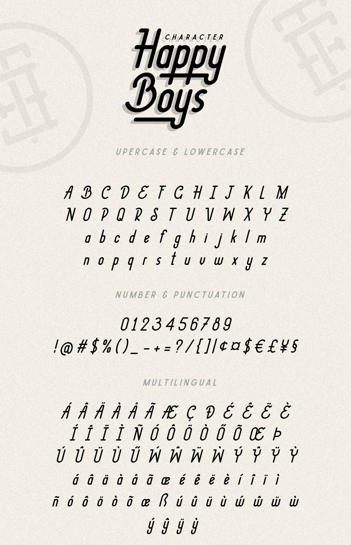 Happy Boys is a clean and clear monoline typeface. Happy Boys perfect for branding, labeling, vintage designing, and more. It includes uppercase standard character, punctuation and multiple language support.