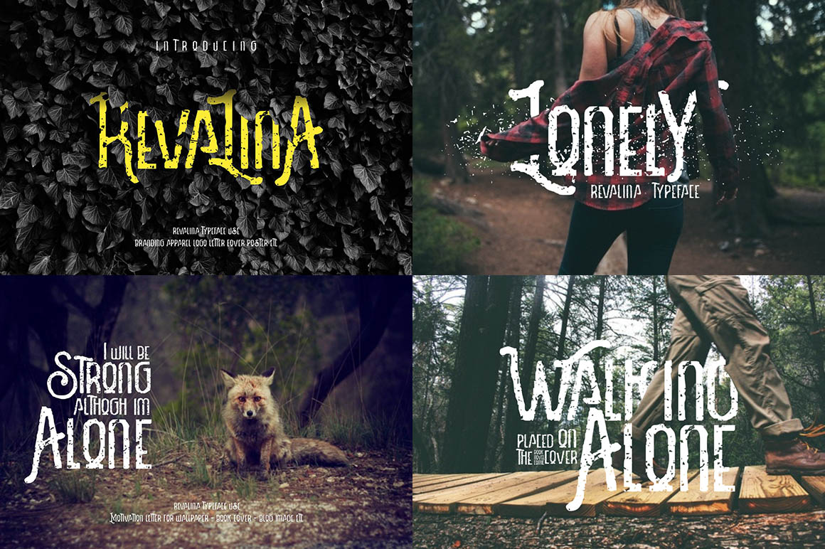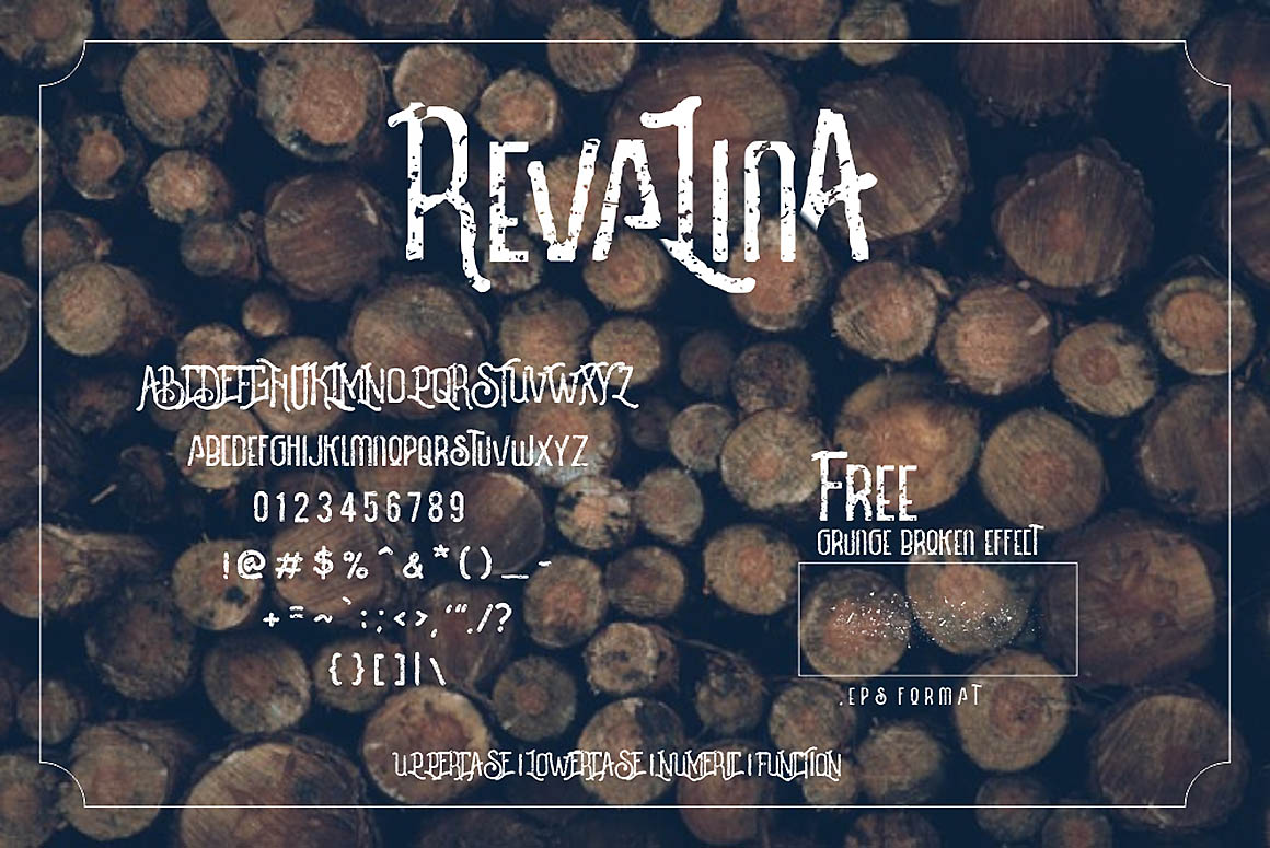 Revalina Typeface is a vintage display type. It suitable for branding, logos, quotes, blog design, modern advertising design, invitation, Home decor, Book/Cover Title, special events, movie poster, album cover, t-shirts, any handmade vintage type needs and more.