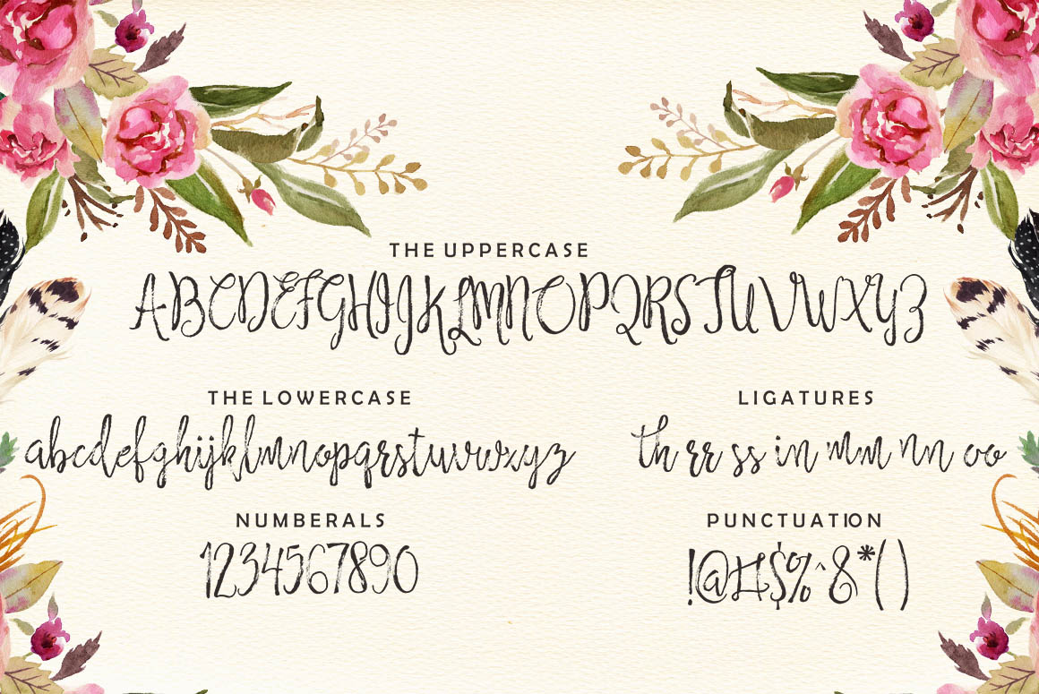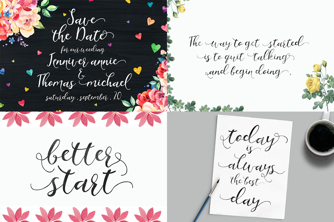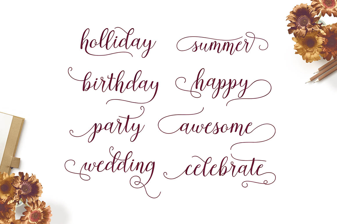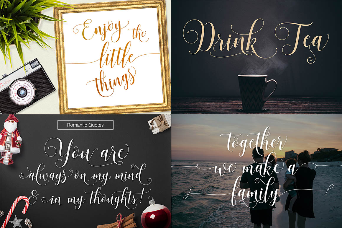 Hellifa Script a new fresh & modern script with a handmade calligraphy style, decorative characters and a dancing baseline! So beautiful on invitation like greeting cards, branding materials, business cards, quotes, posters, and more! Hellifa Script come with 774 glyphs. The alternative characters were divided into several Open Type features such as Swash, Stylistic Sets, Stylistic Alternates, Contextual Alternates, and Ligature. The Open Type features can be accessed by using Open Type savvy programs such as Adobe Illustrator, Adobe InDesign, Adobe Photoshop Corel Draw X version, And Microsoft Word. And this Font has given PUA unicode (specially coded fonts). so that all the alternate characters can easily be accessed in full by a craftsman or designer