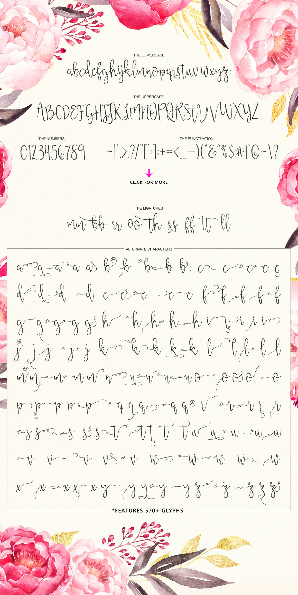 Flowerroom Script is a new hand painted font , elegant, organic fun with dancing baseline. Different alternates and swashes to the beginning and ends of all lowercase. Features 302+ glyphs and 130+ alternate characters. Opentype features with ligatures, stylistic sets and International support for most Western Languages is included. This fonts can be used for various purposes.such as headings, signage, signature, t-shirt, posters, logos, letterhead, wedding invitation, news, lable, badges etc. Flowerroom Script is coded with PUA Unicode, which allows full access to all the extra characters without having special designing software. Mac users can use Font Book , and Windows users can use Character Map to view and copy any of the extra characters to paste into your favourite text editor/app.