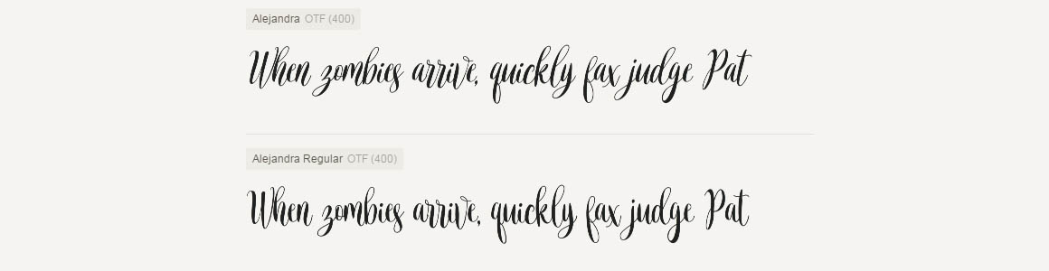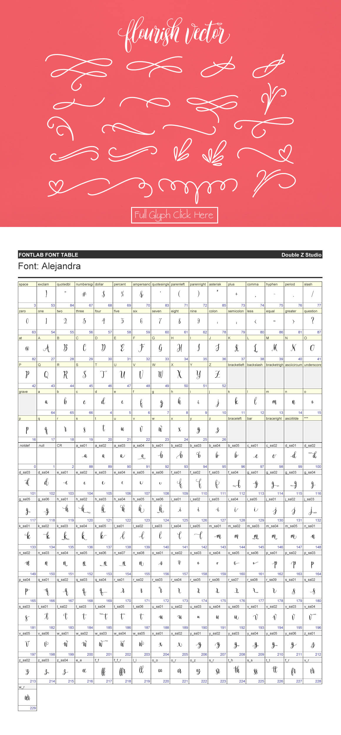 Alejandra is a florishes Handlettering Script. Carefully crafted, comes in regular and italic. Flowing smoothly, perfect for designing book covers, film covers, apparel, cards, logos, posters, etc. Opentype features gives you more alternatives in designing.