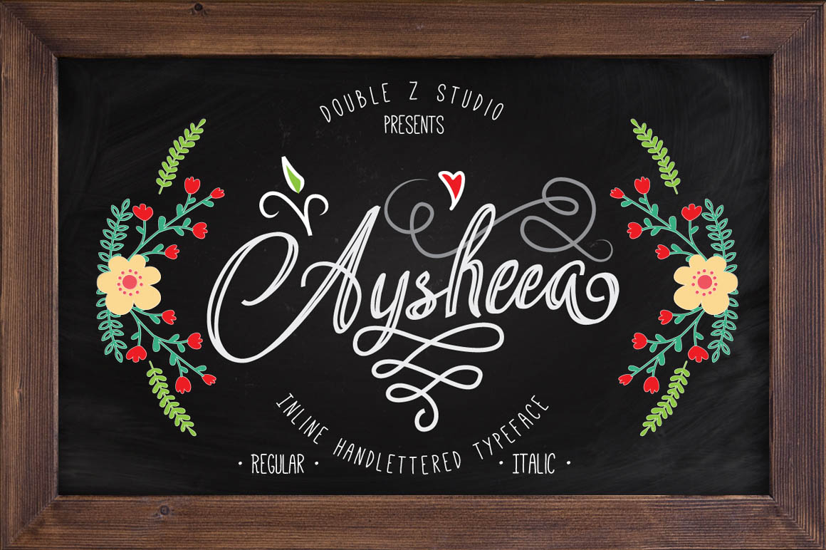 Aysheea is a beautiful new style inline script, comes in regular and italic.The flow is smooth, so perfect for designing book covers, film covers, apparel, cards, logos, posters, etc. Opentype features gives you more alternatives in designing.