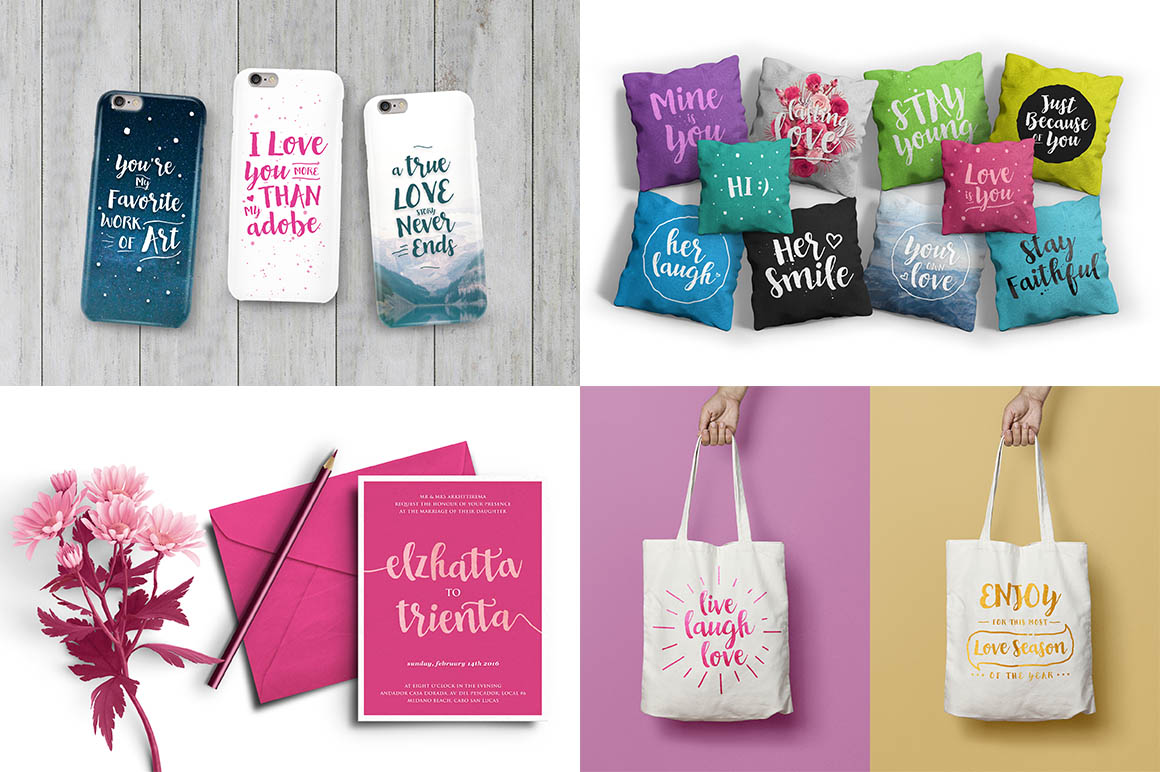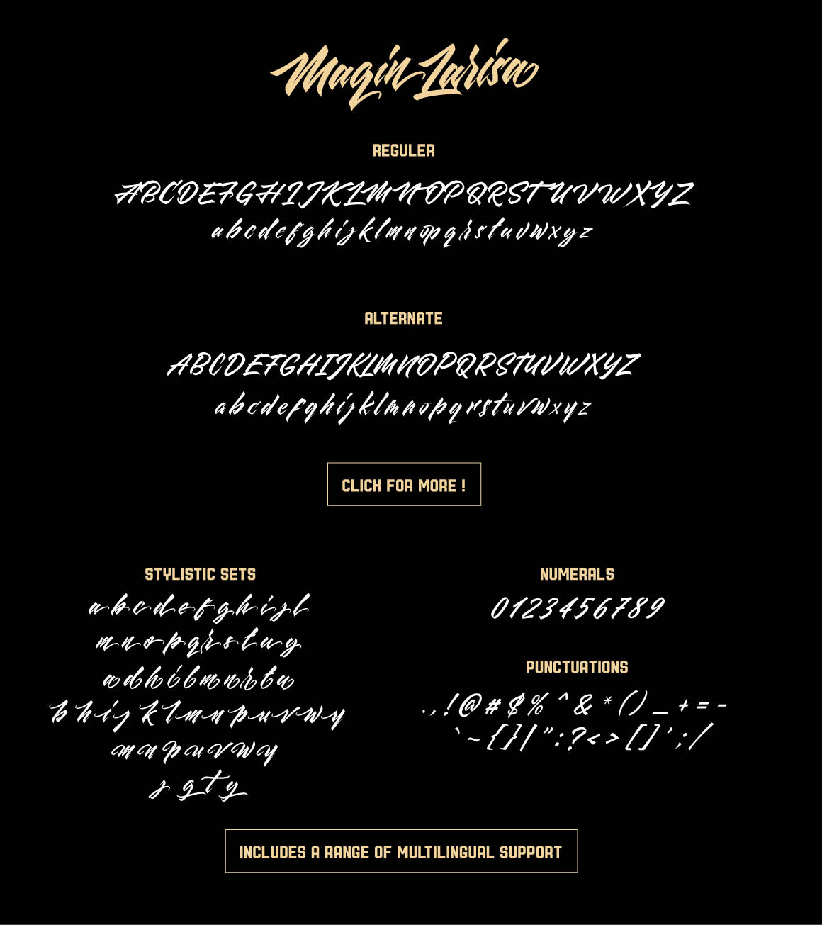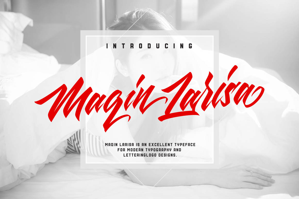 Maqin Larisa an excellent typeface for modern typography design and hand lettering logo designs. Maqin Larisa typeface is also suitable for any design needs, modern invitation design, branding, blog design, modern advertising design, invitation, Art Quote, Home decor, Book/Cover Title, Invitation, special events, birthday, custom mug, pillow, t-shirts, any brush lettering needs and more.