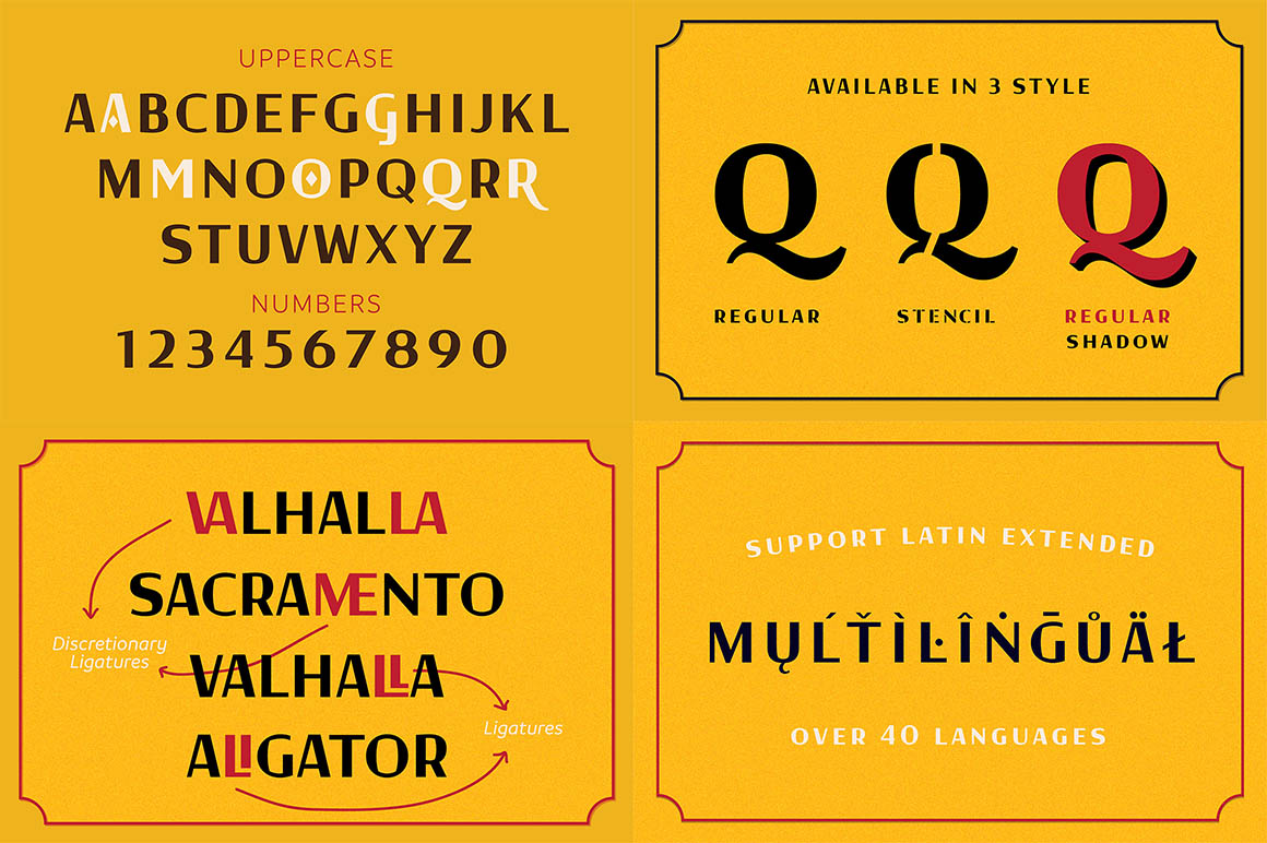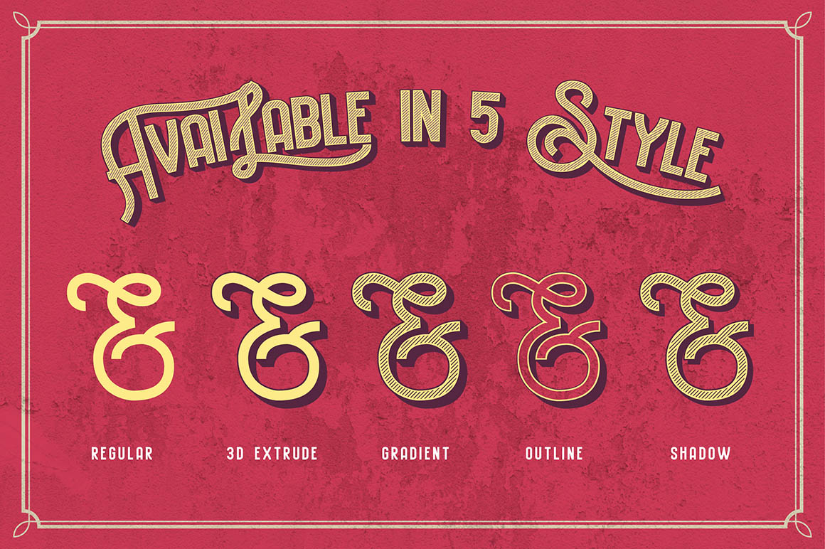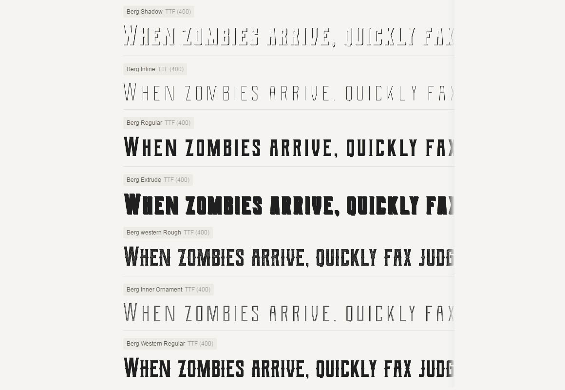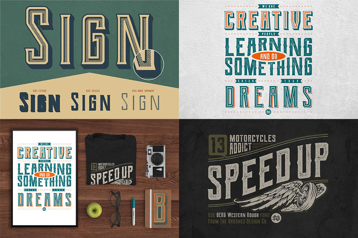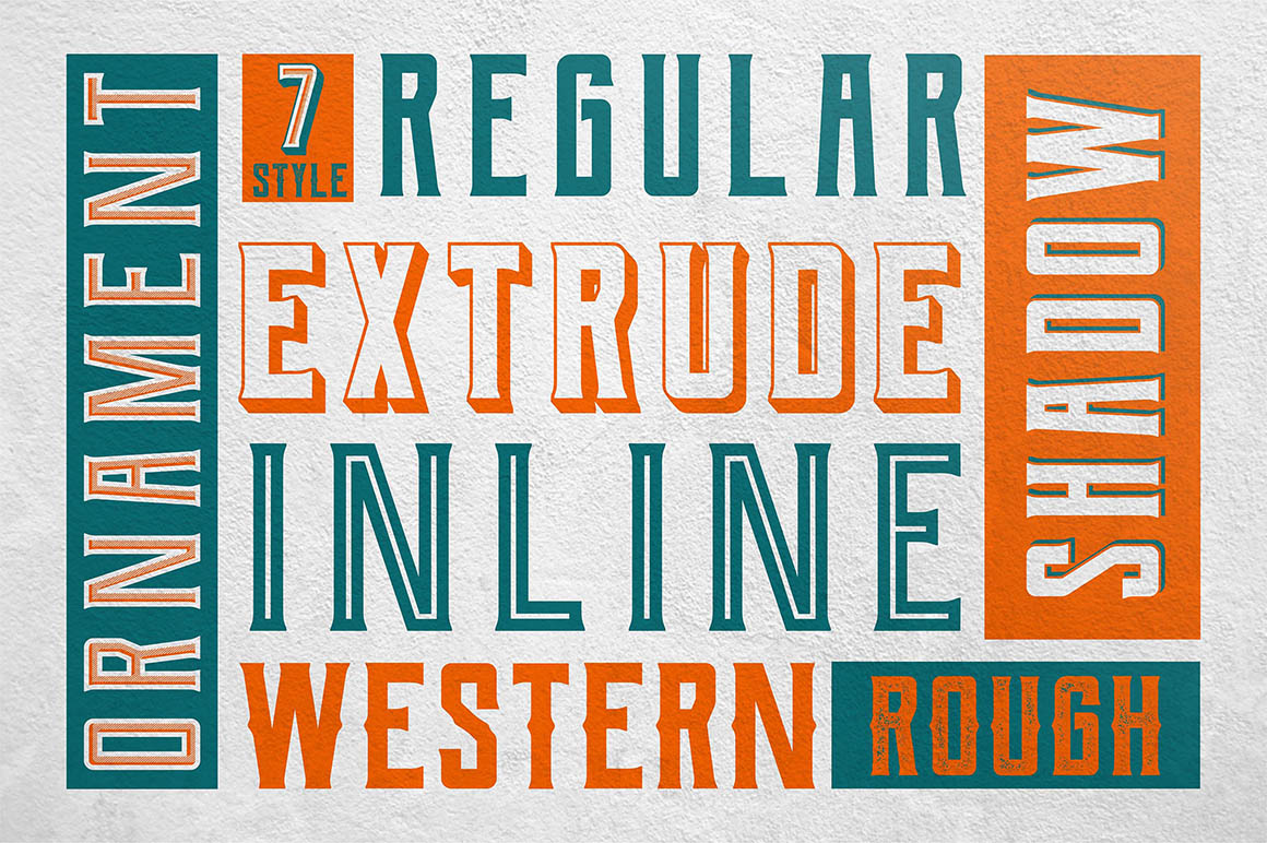 Berg is the layered font family. Inspired by vintage sign painting, poster and label that have a strong shapes so it will create more attention for people to look more closely. Berg comes with 7 font family (Regular, Extrude, Inline, Shadow, Ornament, Western & Rough) includes a full set of capital and lowercase letters, as well as multi-lingual support, currency figures, numerals, and punctuation.You can combine this berg family font to be many different style layered.