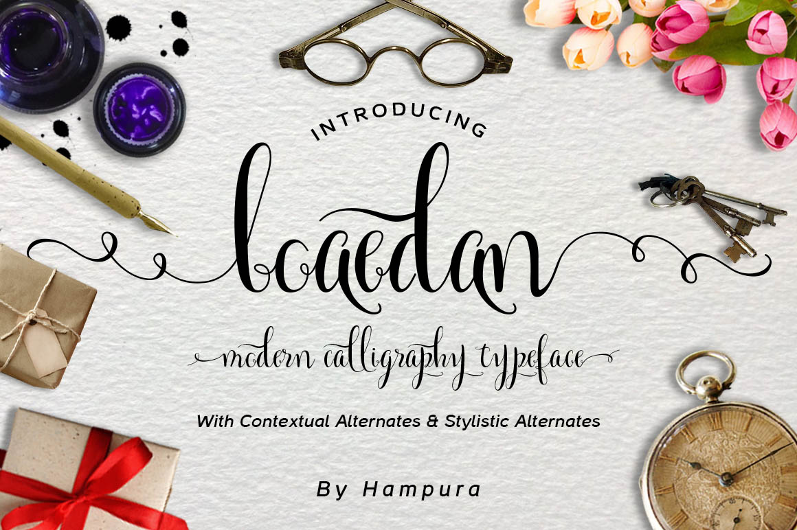 Boaedan Script is modern calligraphy typeface. Many alternate in this font like swash auto connect with initial forms and terminal forms when you activate contextual alternates and stylistic alternates, you can be manual setting letter by letter what you want.