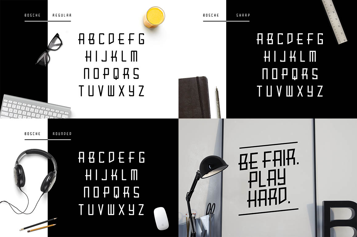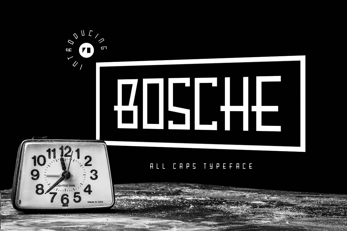 Solid, Precise, Modest. Bosche is a display font that gives you cool and modern touch typography with three different styles. Bosche is a utilitarian typeface inspired by Bauhaus Movement which combined with futuristic touch. It