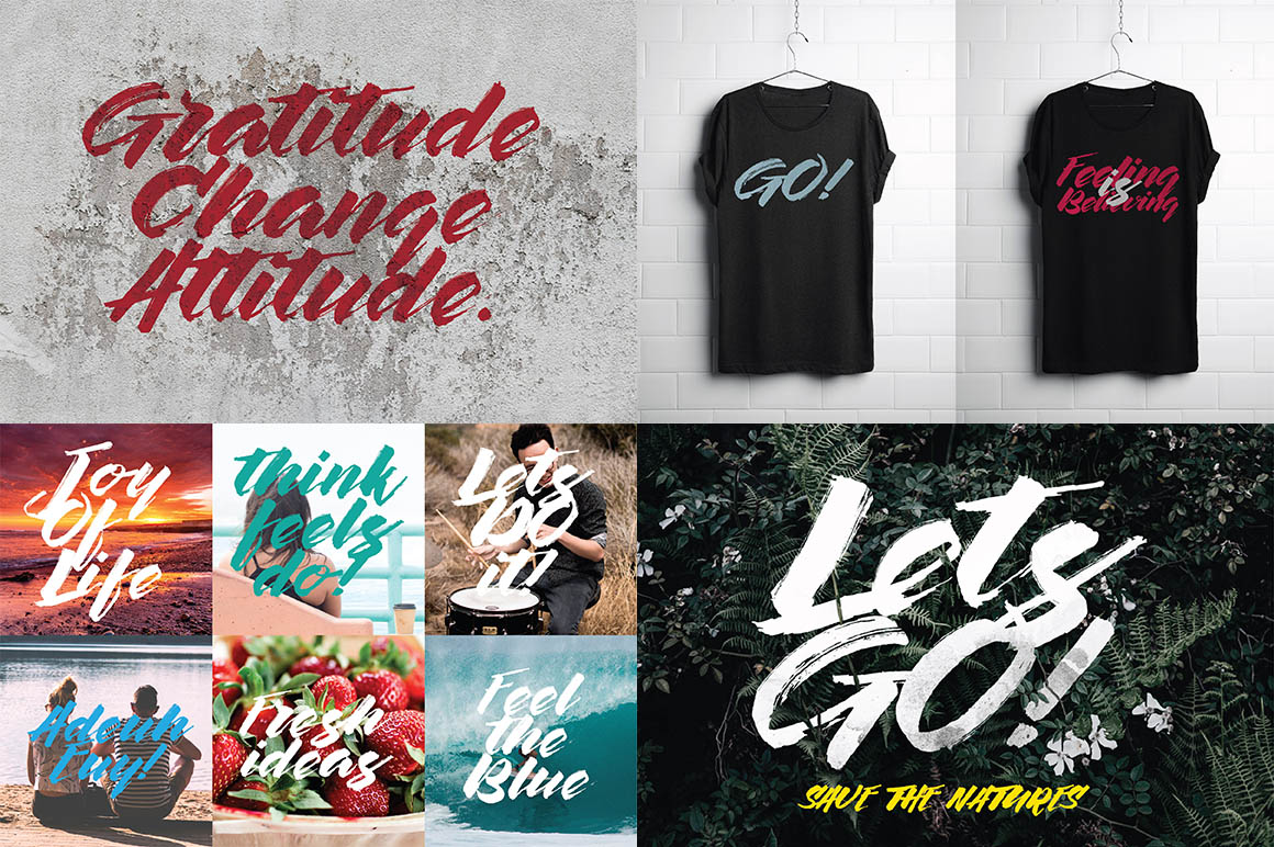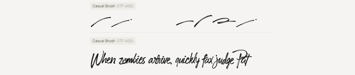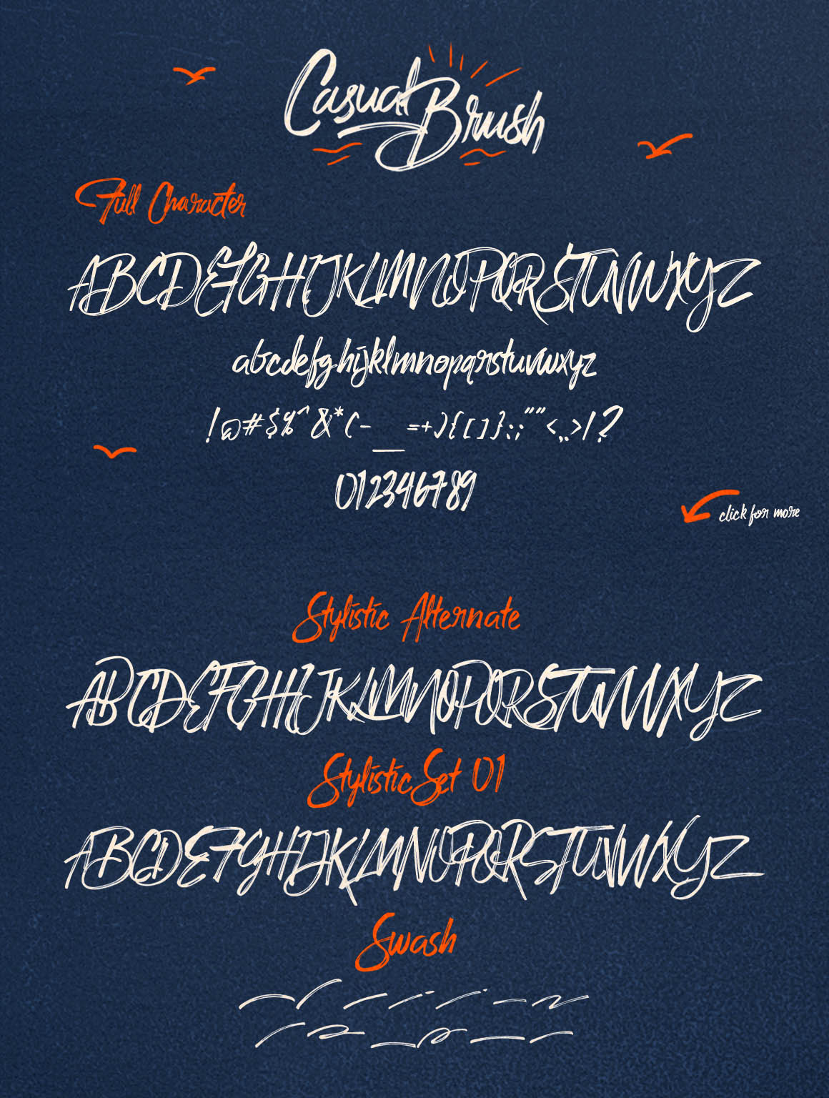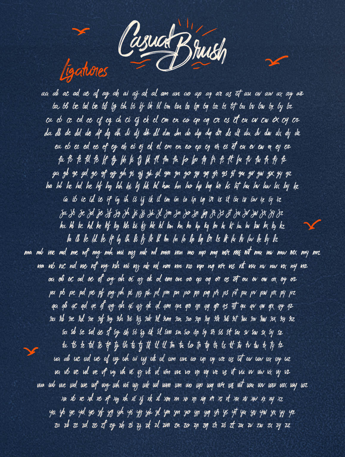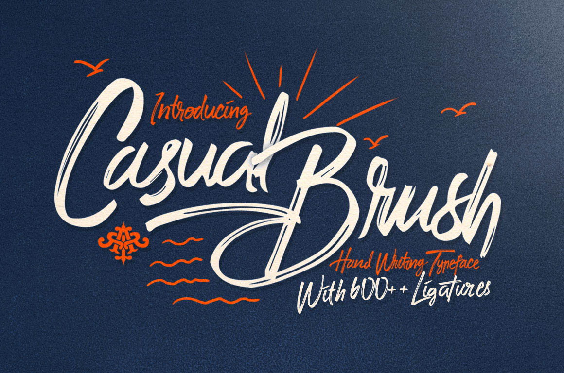 Introducing new hand writing typeface called Casual Brush. Inspired from instant hand writing typography combine with exhausted pen brush. With 600++ ligature pairs and 2 stylistic alternates Casual Brush offer the hand writing feel with different combination letter in every single word. Casual Brush Typeface best uses for Logo, Logo type, quotes, apparel design, invitations, flyer, poster, greeting cards, product packaging, headers, printed quotes, cover album, etc.