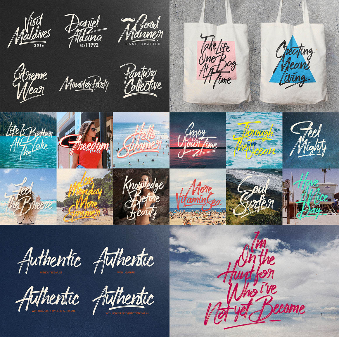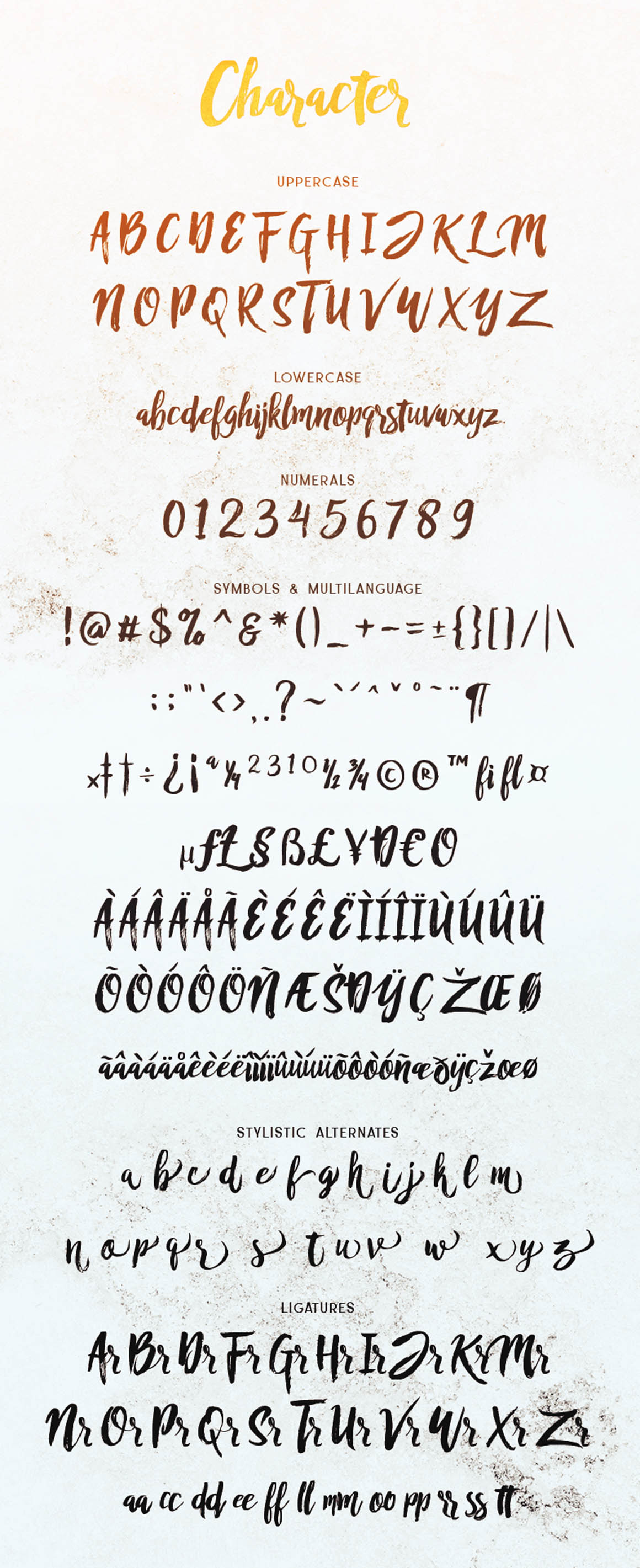 Hollic Brush a new hand elegant brush script font. This font will look gorgeous on all your designs, branding materials, blog headers, business cards, quotes, invitations and more! Hollic Brush come with 462 glyphs. The alternative characters were divided into several Open Type features such as Swash, Stylistic Sets, Stylistic Alternates, Contextual Alternates, and Ligature. The Open Type features can be accessed by using Open Type savvy programs such as Adobe Illustrator, Adobe InDesign, Adobe Photoshop Corel Draw X version, And Microsoft Word. And this Font has given PUA unicode (specially coded fonts). so that all the alternate characters can easily be accessed in full by a craftsman or designer