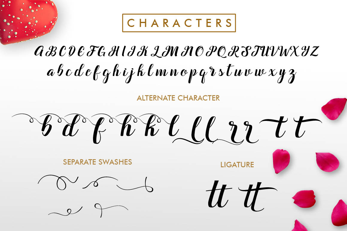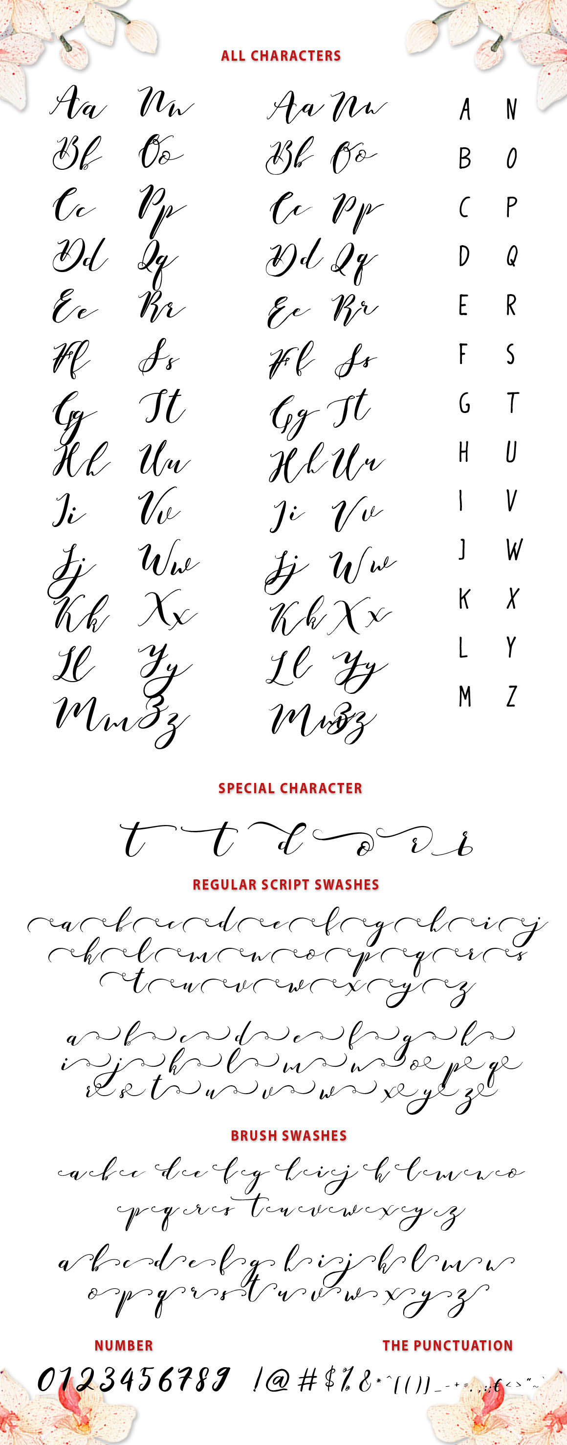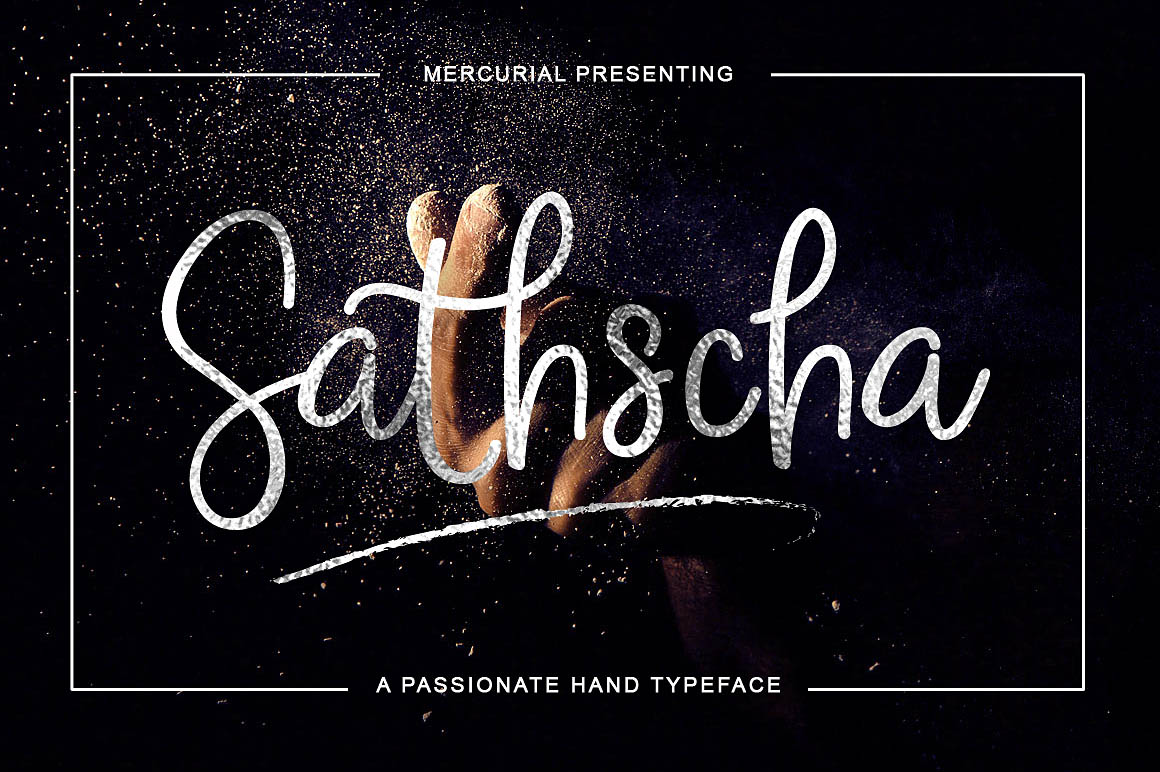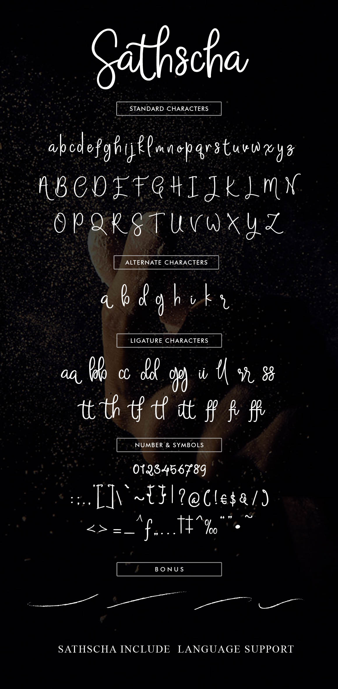 Introducing Sathscha, a typeface created stylized handwriting is clearly visible charms, made more elegant impression posts and more passionate. It comes with different styles that will make a wonderful impression. Natural handwriting style will be very suitable for logos, branding, posters, greeting cards, wedding, t-shirts, vintage, or anything requiring a sprinkle of elegance. The font has 356 glyphs, and supported by other languages. also has several alternative letter, ligature and swash bonus that will make it easier for designers do different variations of the design.