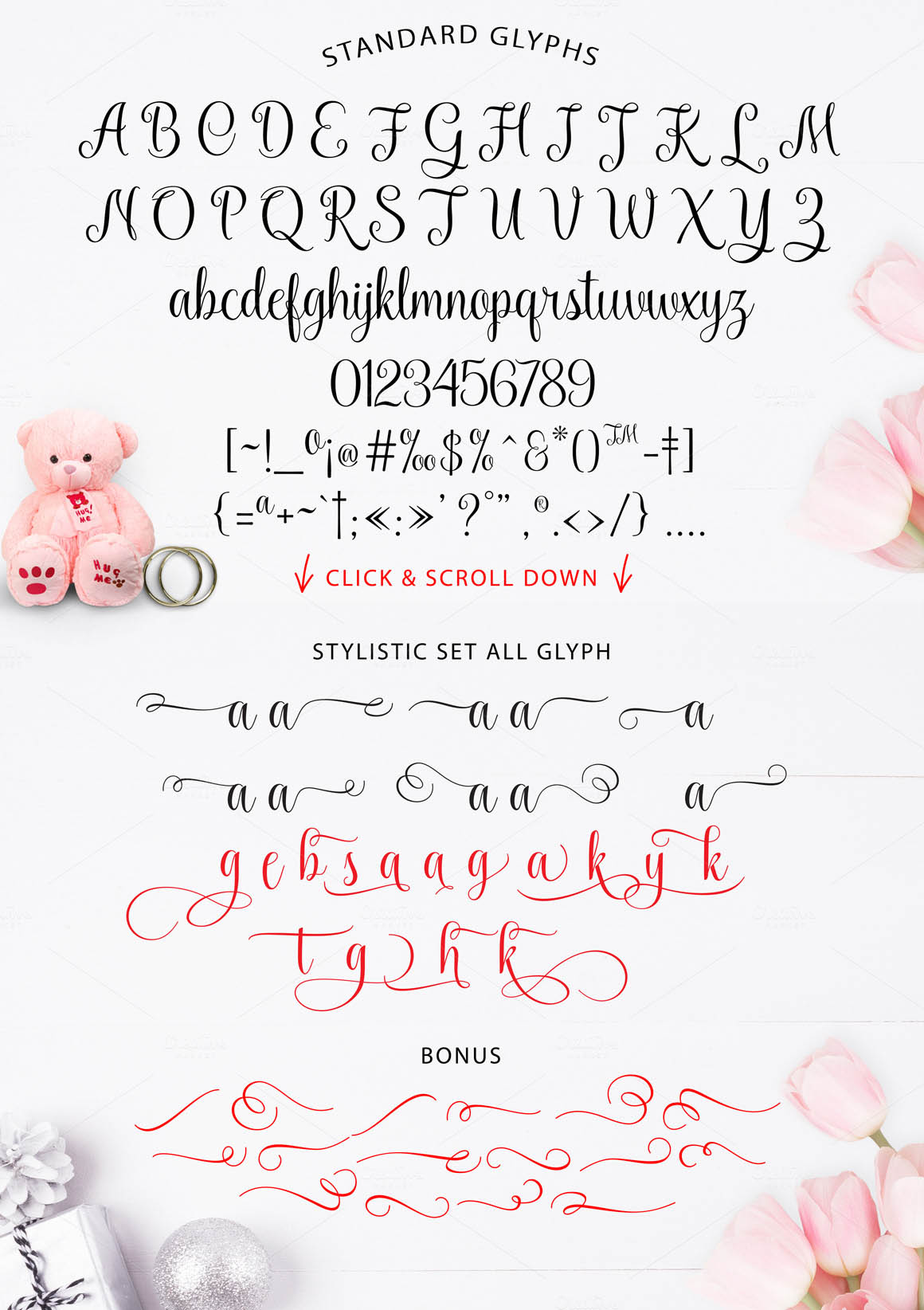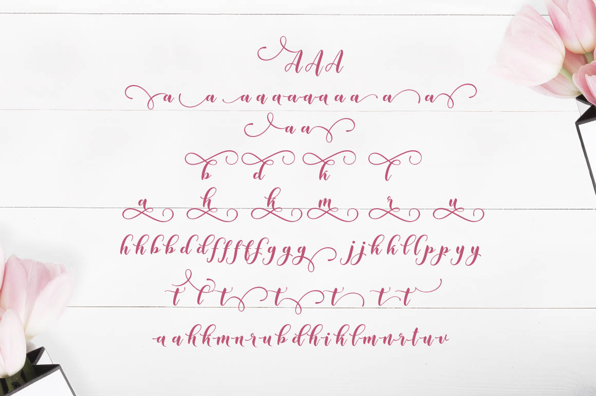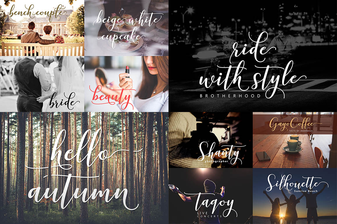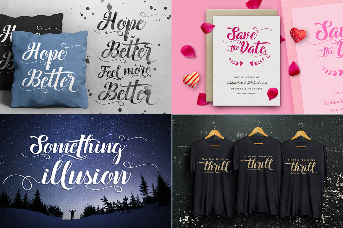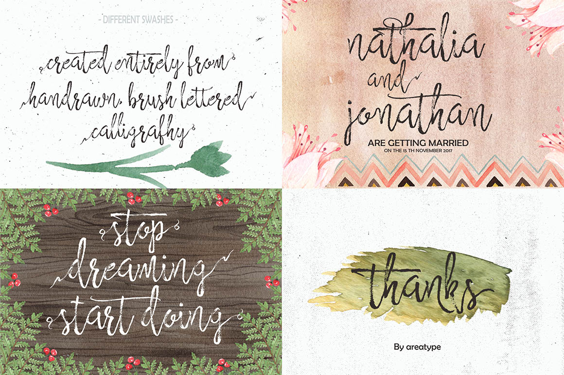 Introducing Sathscha, a typeface created stylized handwriting is clearly visible charms, made more elegant impression posts and more passionate. It comes with different styles that will make a wonderful impression. Natural handwriting style will be very suitable for logos, branding, posters, greeting cards, wedding, t-shirts, vintage, or anything requiring a sprinkle of elegance. The font has 356 glyphs, and supported by other languages. also has several alternative letter, ligature and swash bonus that will make it easier for designers do different variations of the design.