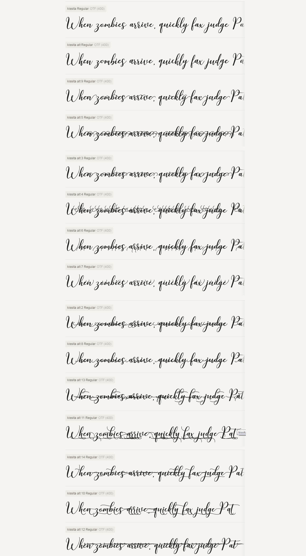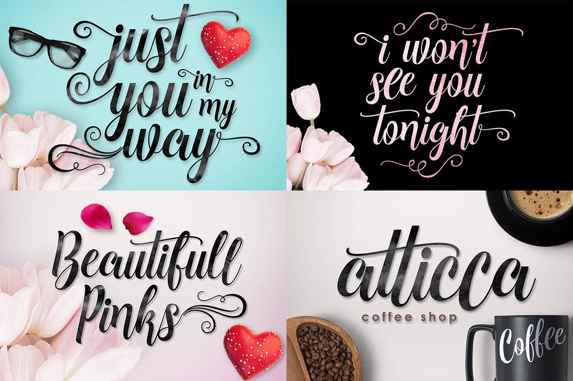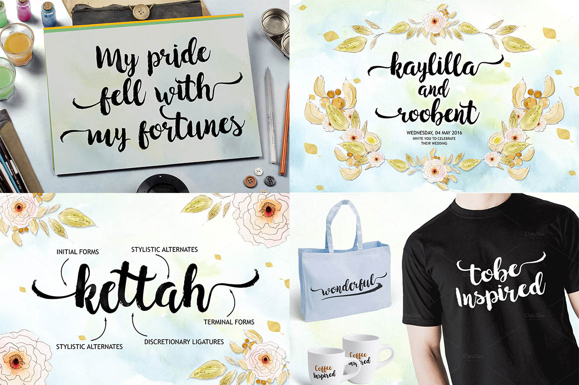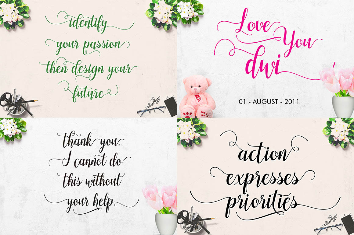 Kissita is modern script font, every single letters have been carefully crafted to make your text looks beautiful. With modern script style this font will perfect for many different project, e.g : quotes, blog header, poster, wedding, branding, logo, fashion, apparel, letter, invitation, stationery, etc. Kissita including alternate glyphs and beautiful swirl in a font including stylistic sets, Ligatures etc. The Open Type features can be accessed by using Open Type savvy programs such as Adobe Illustrator CS, Adobe Indesign & CorelDraw X6-X7 and Microsoft Word. And this Font has given PUA unicode (specially coded fonts). so that all the alternate characters can easily be accessed in full by a craftsman or designer.