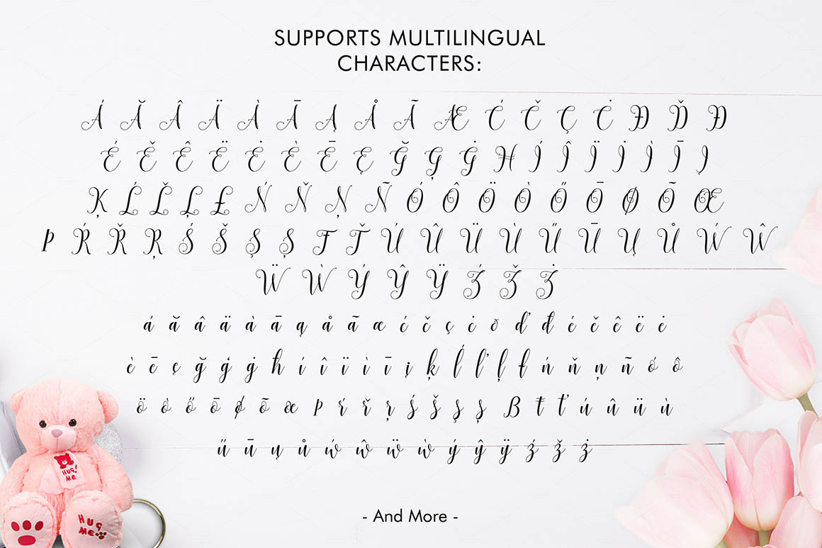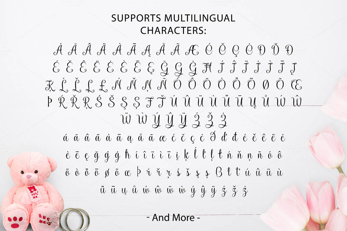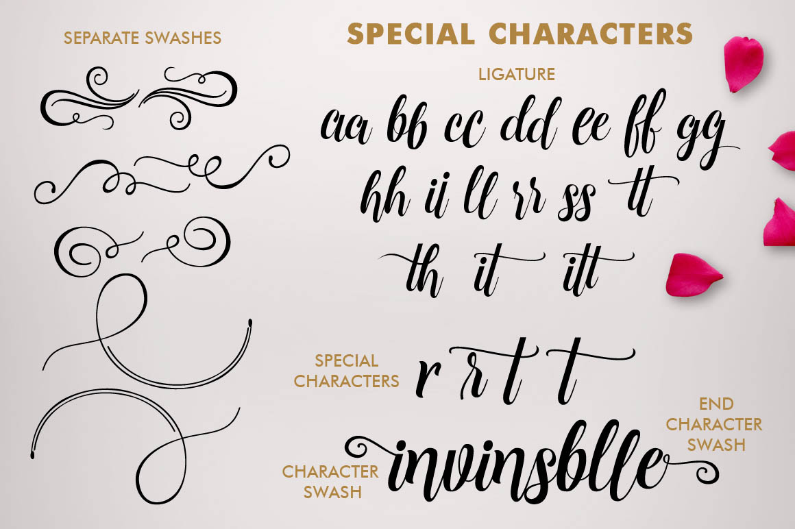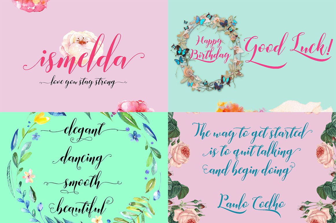 Ismelda Script is a modern calligraphy font, with characters dance along the baseline and elegant touch. With almost 553 glyphs. Opentype features with stylistic alternates, ligatures and multiple language support. Can be used for various purposes.such as logos, wedding invitation, letterhead, signage,news, t-shirt, heading lable, posters, badges etc. Ismelda Script is coded with PUA Unicode, which allows full access to all the extra characters without having special designing software. Mac users can use Font Book , and Windows users can use Character Map to view and copy any of the extra characters to paste into your favourite text editor/app.