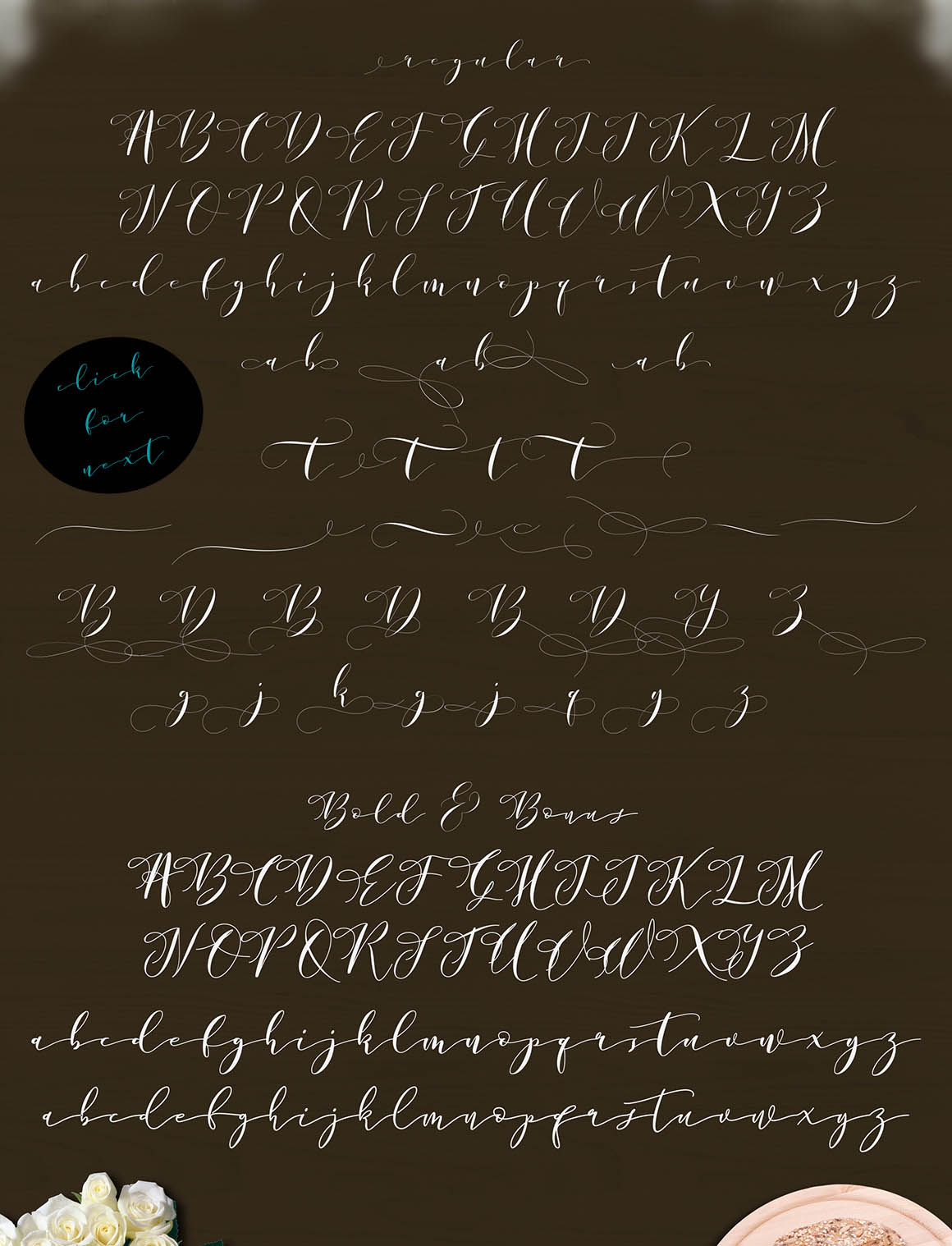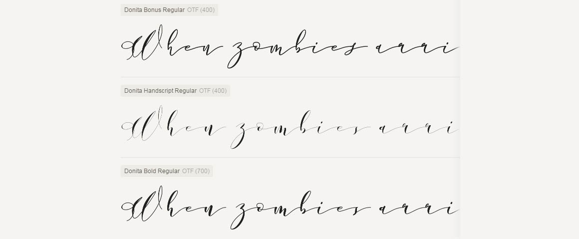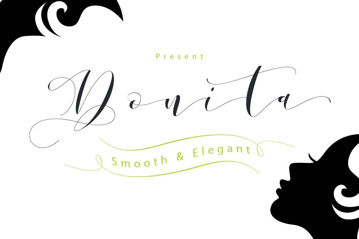 Donita Script is a new varieties of handlettered script font, allowing you to completely make-each word look stylish! With smooth style and petite, elegant with a long thin connections that make it look luxurious and original. Donita comes with a total of 385 glyphs complete with swooshes.