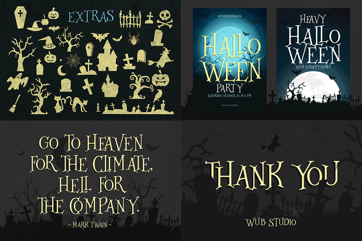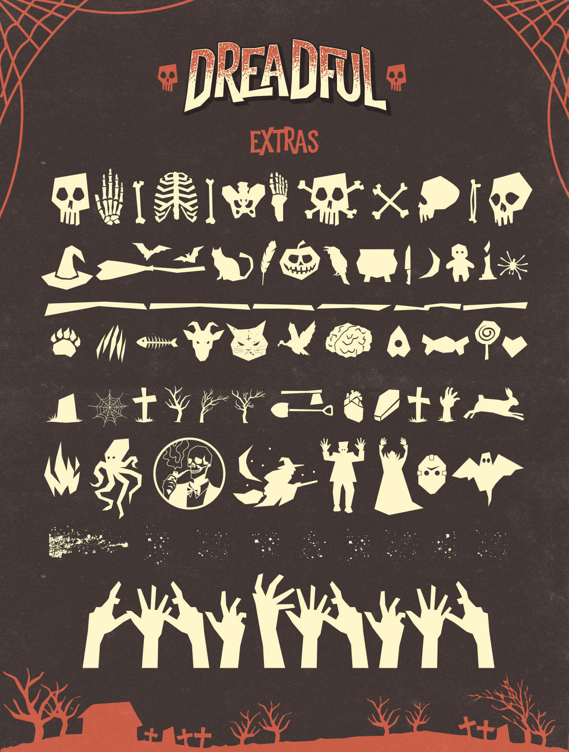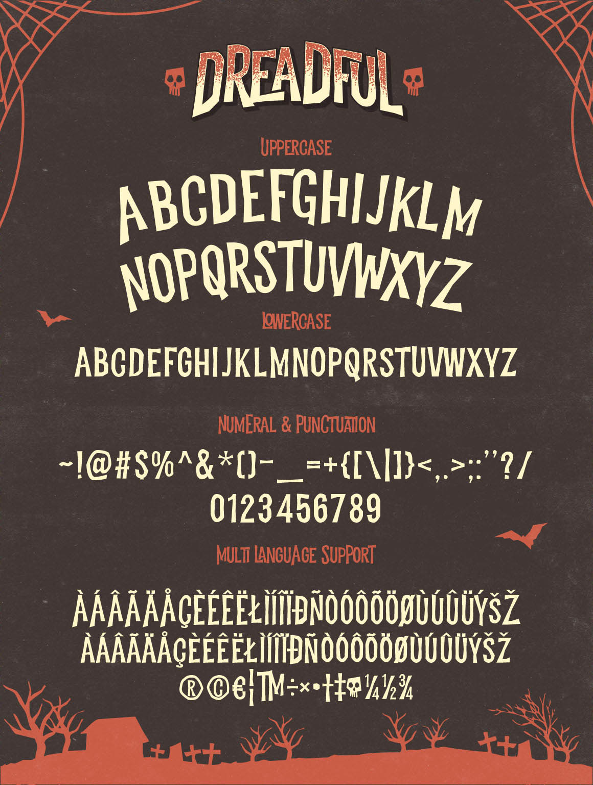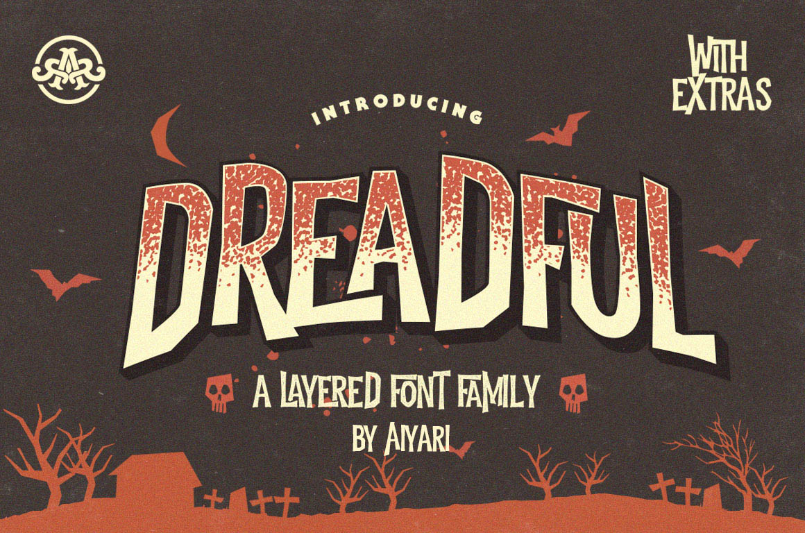Introducing a new layered typeface called Dreadful Inspired from classic horror movie and vintage comic. Dreadful Typeface best uses for headings, logo type, quotes, apparel design, invitations, flyer, poster, greeting cards, product packaging, book cover, printed quotes, cover album, movie, etc. You’ll find here 4 fonts and 3 vector extra graphics!