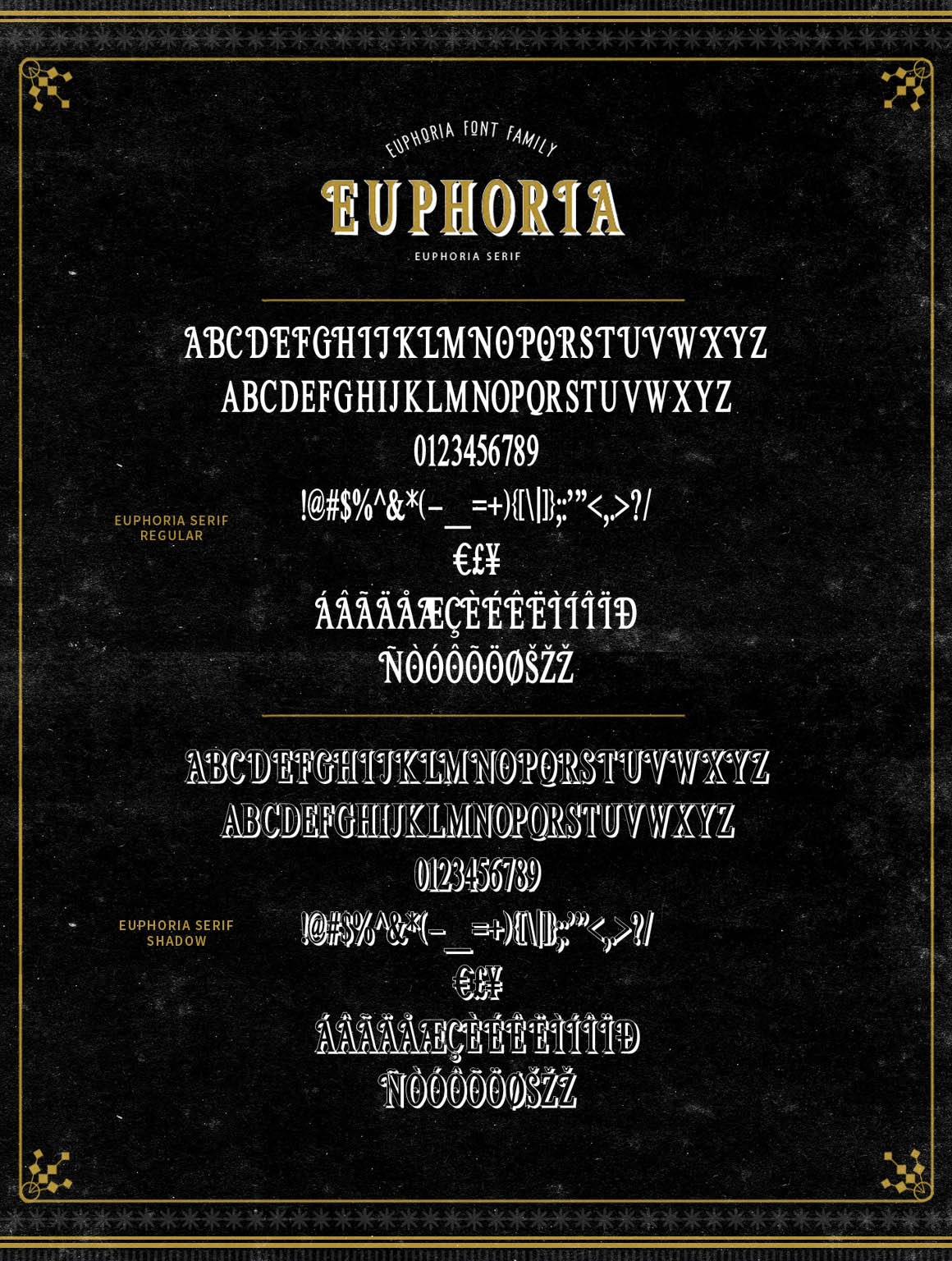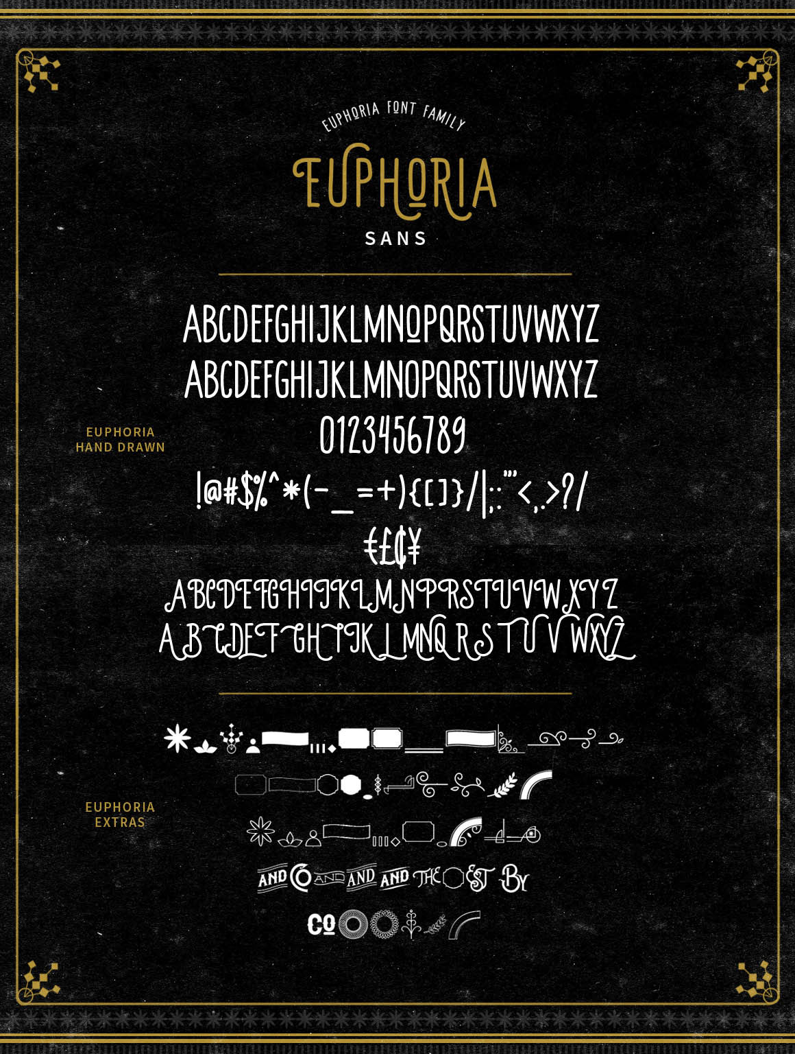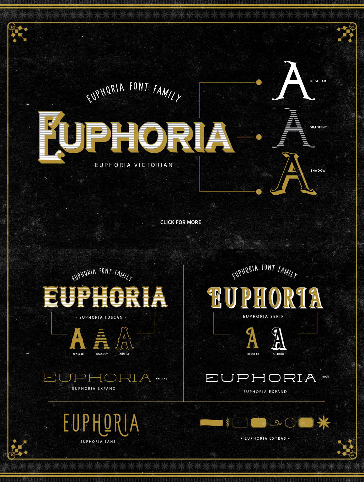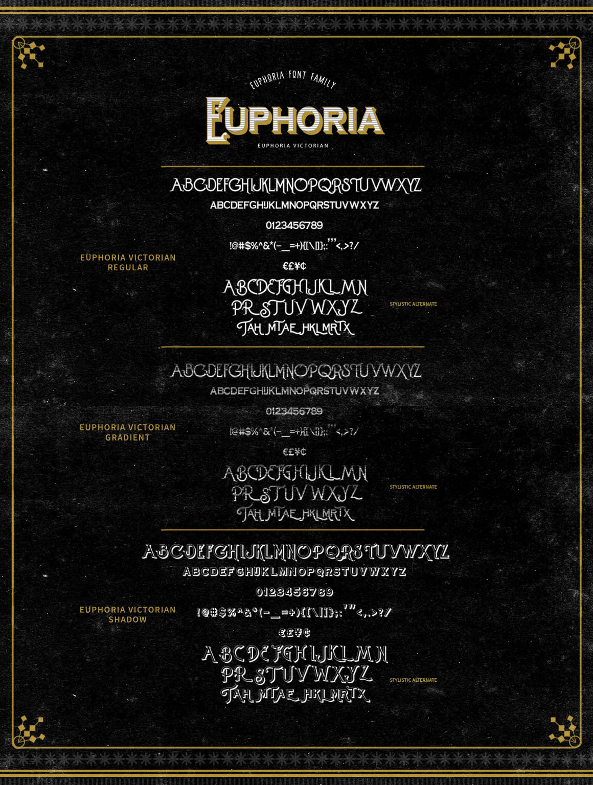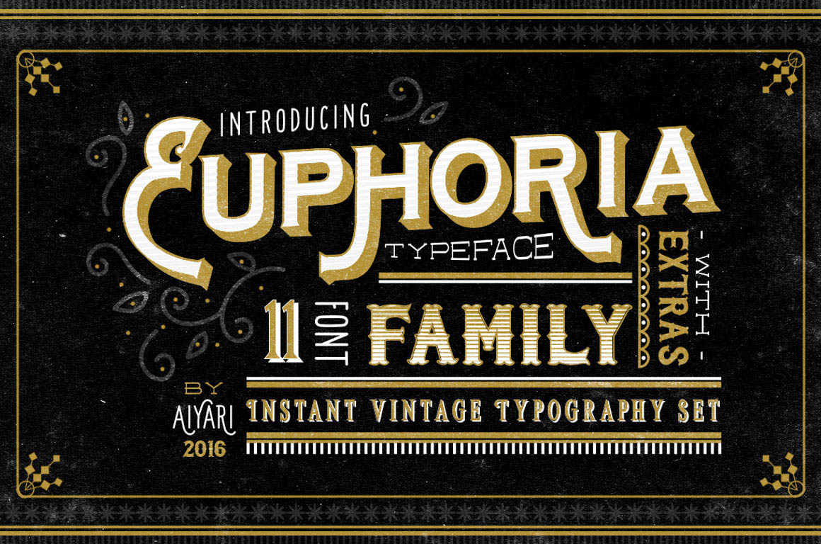 Introducing Euphoria Font Family. Well crafted typeface inspired by victorian and vintage typography. With 11 font and 1 extras files that work well together to make an instant vintage design. The typeface Ideal for : Logo, quotes, invitations, signage, poster, greeting cards, packaging, headers, printed quotes, cover album, etc.