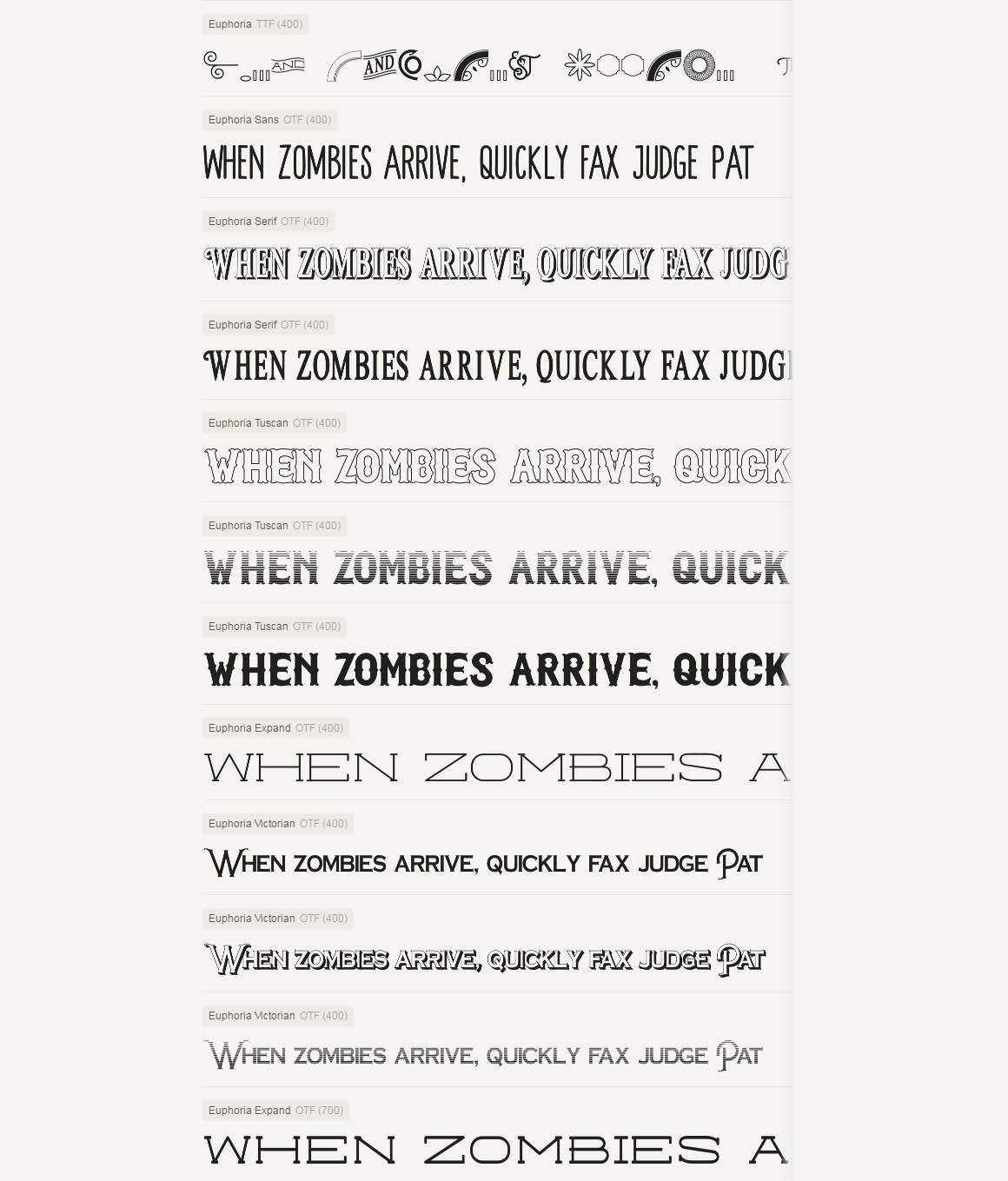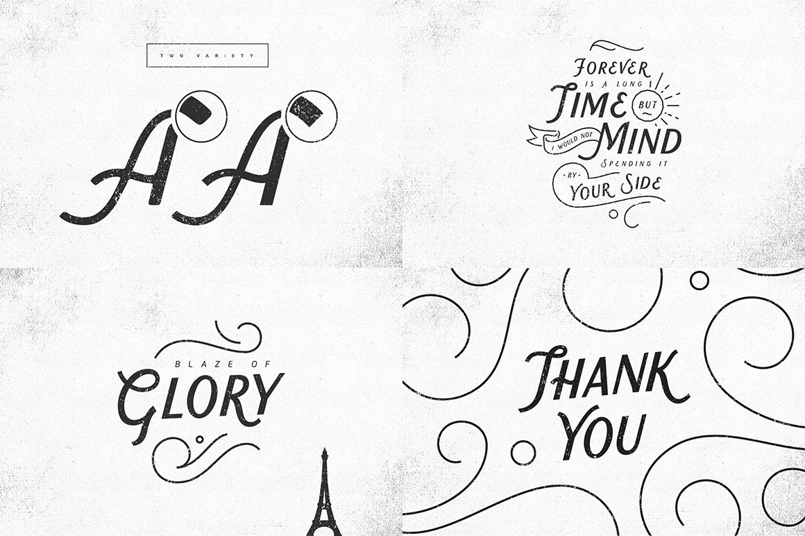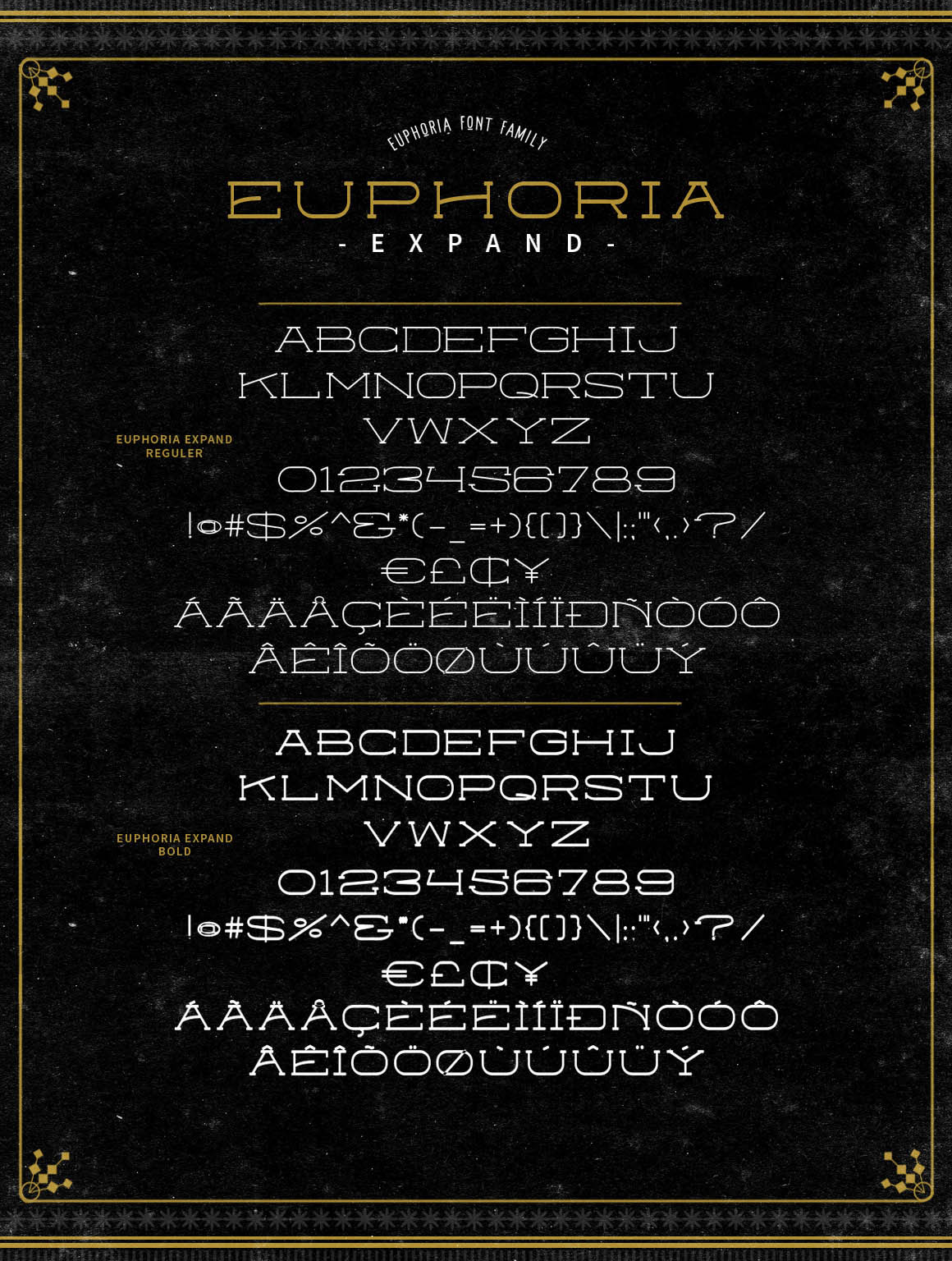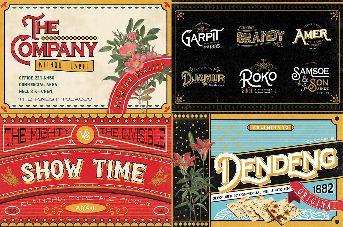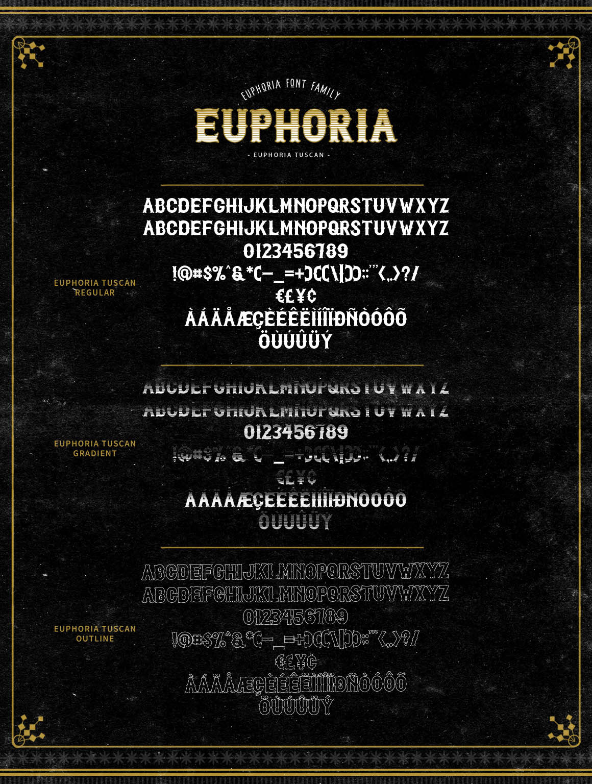 Introducing Euphoria Font Family. Well crafted typeface inspired by victorian and vintage typography. With 11 font and 1 extras files that work well together to make an instant vintage design. The typeface Ideal for : Logo, quotes, invitations, signage, poster, greeting cards, packaging, headers, printed quotes, cover album, etc.