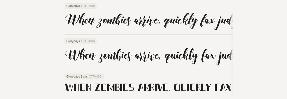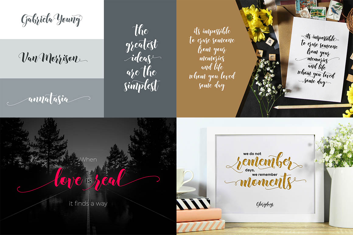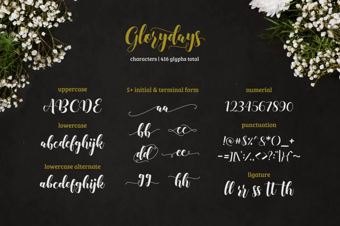 Glorydays is a glamorous calligraphy / script and sans serif (allcaps) font. Glorydays typeface is suitable for any design needs, modern invitation design, branding, blog design, modern advertising design, invitation, Art Quote, Home decor, Book/Cover Title, Invitation, special events, birthday, custom mug, pillow, t-shirts, any brush lettering needs and more. Glorydays typeface have 473 glyphs, comes with upper and lowercase Standard Characters, Punctuation, Numerals. And other Glyphs variation of the OpenType features such as Standard Ligature, Stylistic Alternate and 12 Stylistic Set (ss01 – ss12). Accessible in the Adobe Illustrator and adobe indesign Glyphs panel, or under Stylistic Alternates in the Adobe Photoshop OpenType menu. and Accessible the glyphs in the CorelDraw on the Menu Bar click Text select Insert Character.