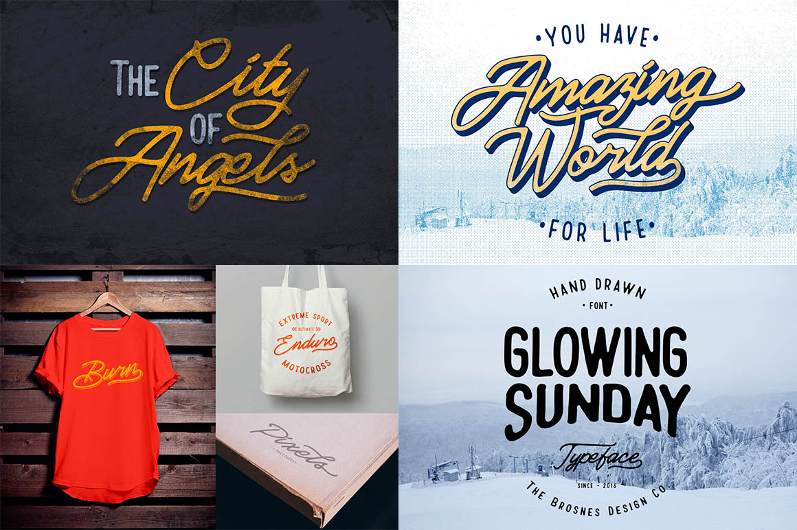 Huskey is script font, Glowing Sunday is a san serif font, both suitable to be paired or combined for a nice design. Combine these two fonts for various purposes. such as Branding, Logos, Posters, Apparel graphic, Letterhead, Letterpress, Packaging designs, Typographic Design, Apparel, Book cover and so much more…