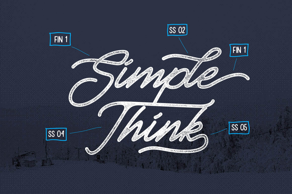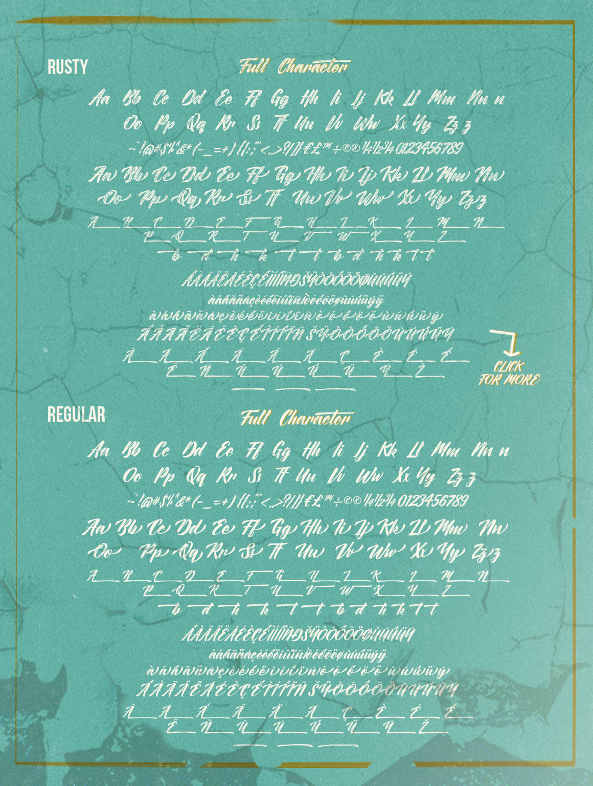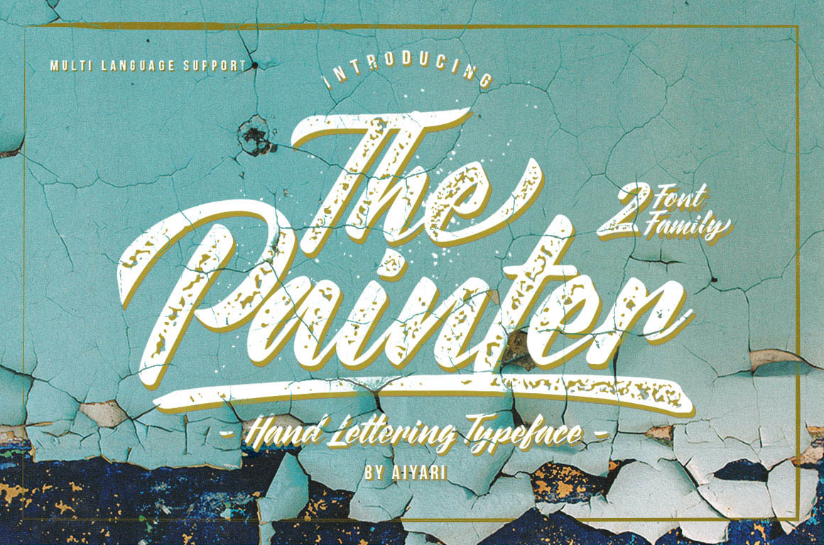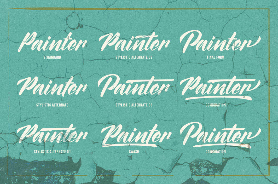 A hand lettering typeface inspired by traditional sign painting and brush lettering. The typeface family includes two styles (regular & rusty) with alternate characters who divided into open type features such contextual alternate, stylistic alternates, stylistic sets, ligature, fina, & swash. With 420 characters The painter will help you to create an attractive message for your design. The Painter best uses for Logo, Logo type, quotes, apparel design, invitations, flyer, poster, greeting cards, product packaging, headers, printed quotes, cover album, etc.