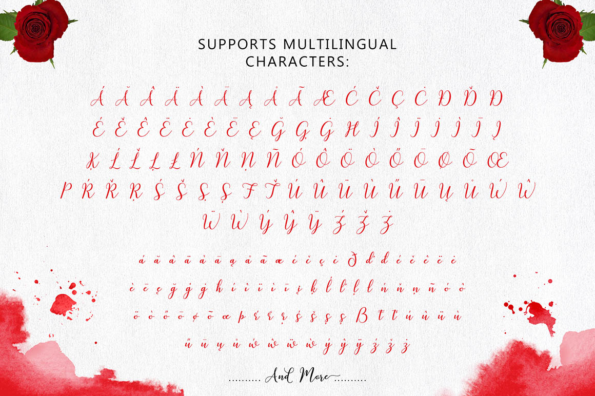 Charissa Script is a new hand brushed font , elegant, organic fun with dancing baseline. Different alternates and swashes to the beginning and ends of all lowercase. Features 307+ glyphs and 130+ alternate characters. Opentype features with ligatures, stylistic sets and International support for most Western Languages is included. This fonts can be used for various purposes.such as headings, signage, signature, t-shirt, letterhead, wedding invitation, logos, news, posters, lable, badges etc. Charissa Script is coded with PUA Unicode, which allows full access to all the extra characters without having special designing software. Mac users can use Font Book , and Windows users can use Character Map to view and copy any of the extra characters to paste into your favourite text editor/app.