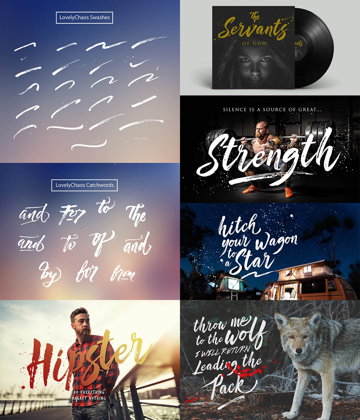 LovelyChaos is a chaotic beautiful script.Imperfect flow and grunge style combined with script create awesome elegant and grunge feel at the same time. Awesome for designing book covers, film covers, apparel, cards, logos, posters, etc. Opentype features gives you more alternatives in designing.