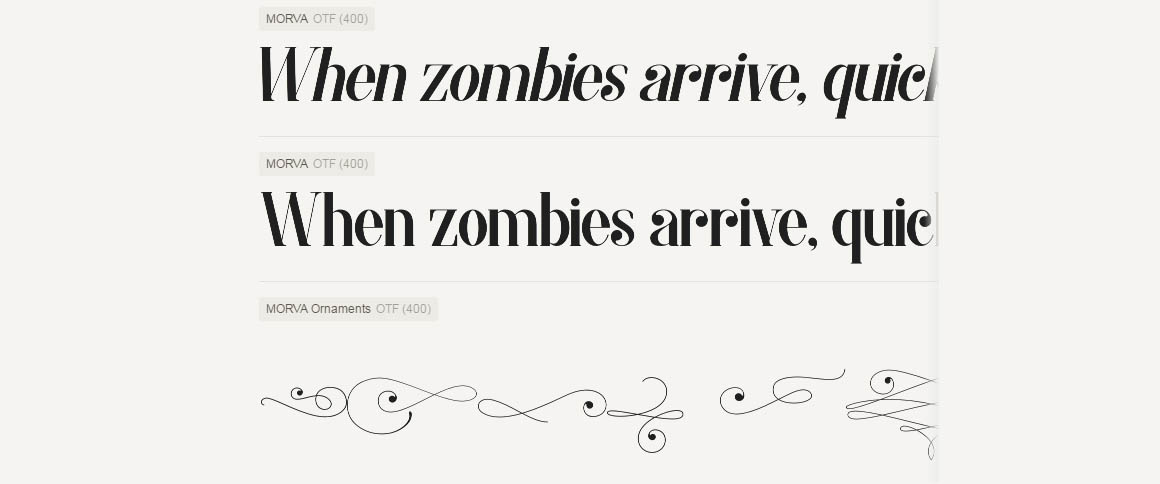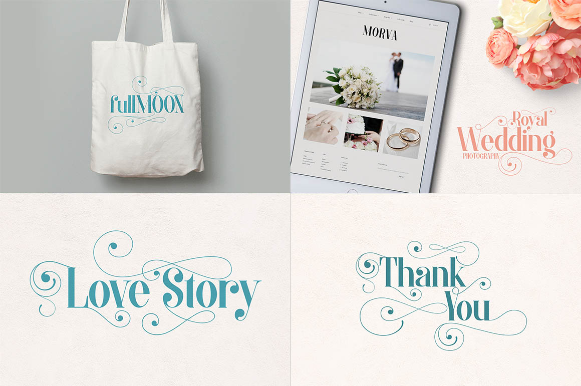 Introducing MORVA TYPEFACE a simple and beautiful font made with persistence and passion. MORVA typeface have a unique character when compared with the others serif font, it have special bracketed serif shape and combine with beautiful swirl ornament’s. MORVA typeface is suitable for simple logo design, website header, wedding design, menu fonts for website. to design fashion, and others who have a minimalist and simple concept.