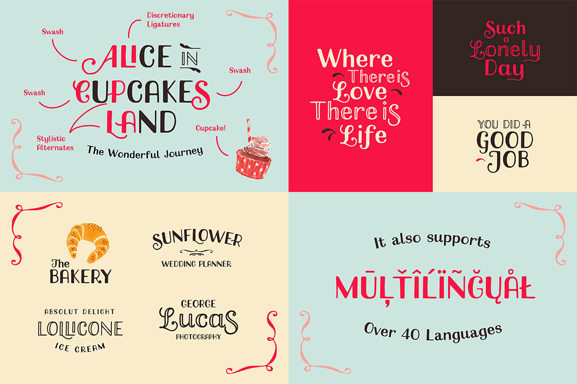 Macaron is a lovely and beautiful handcrafted typeface, crafted with love and care. Served with a lots of playful alternates and swashes. also a bunch of Cupcakes Watercolour Vector that complete this beautiful set. Macaron available in two Styles! REGULAR and OUTLINE. Designed for headlines and Logotypes, an invitation. anything you want it to look cute and lovely.