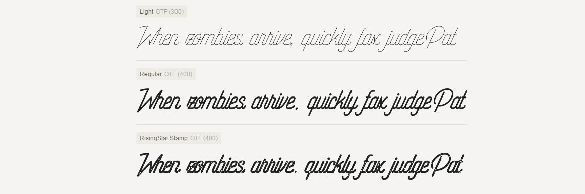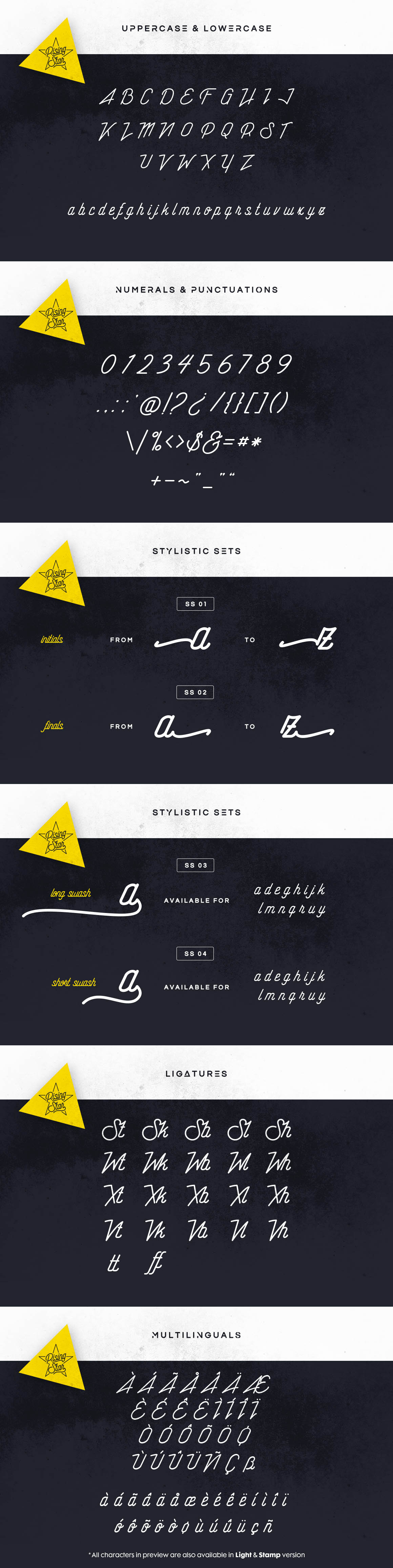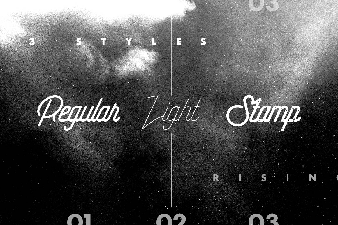 Rising Star is a modern monoline script with an adventurous mood. It is inspired by, well, nostalgic summer camp, in the wood and near the lake, a warm laught with best friends and unlimited stars in the clear night sky. Rising Star turns our nostalgia for summer into a dynamic and vivacious font that comes in three different styles to choose from; Regular, Light, and Stamp. Rising Star comes in three weights making the font versatile and useful both for web and print; think websites, posters, menus, logotypes, cards, signage, packaging and whatnot. Rising Star is friendly, sturdy and it makes a statement, but most of all, it is fun to play with.