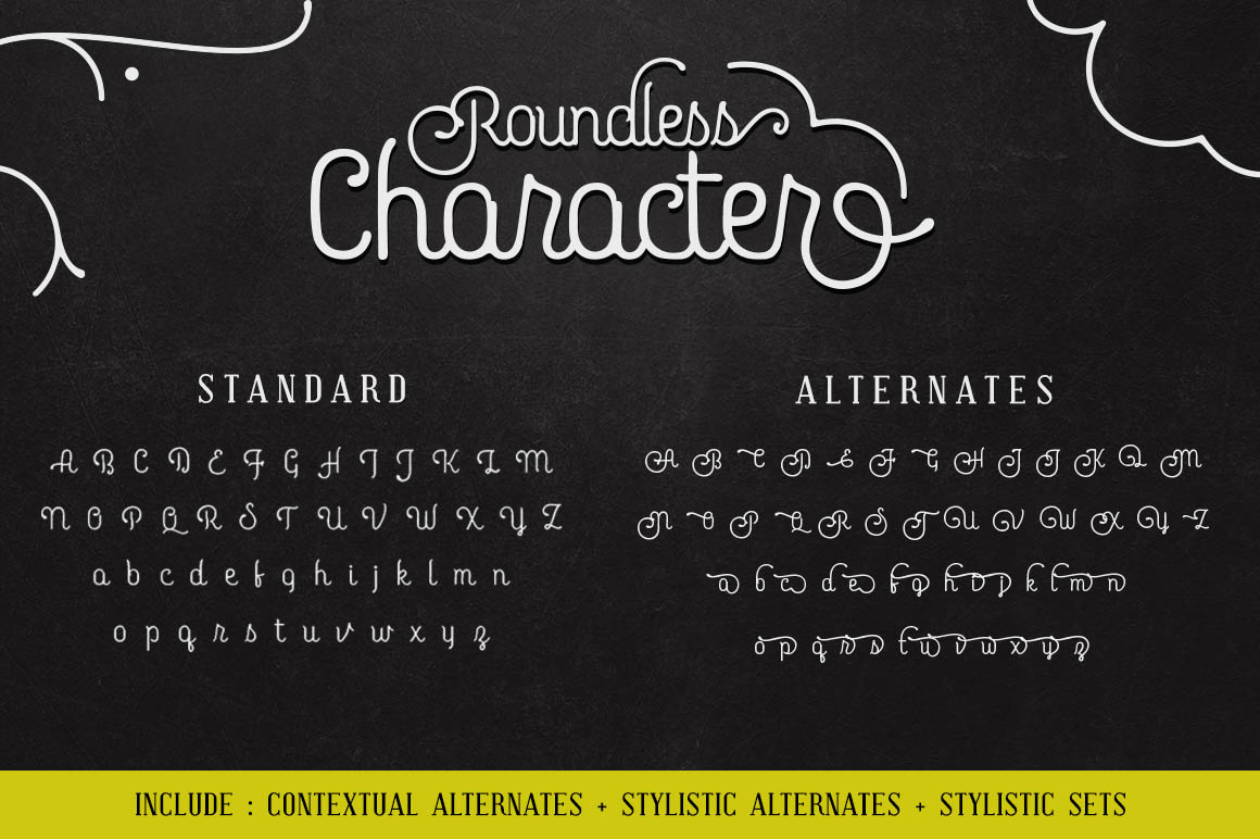 Roundless Script is modern typeface. Many alternate in this font like swash auto connect with initial forms and terminal forms when you activate contextual alternates and stylistic alternates, you can be manual setting letter by letter what you want.