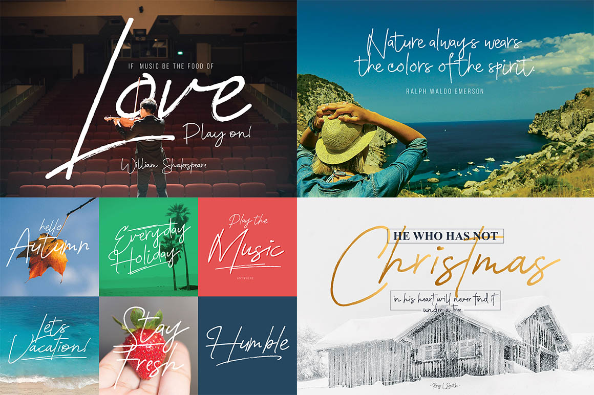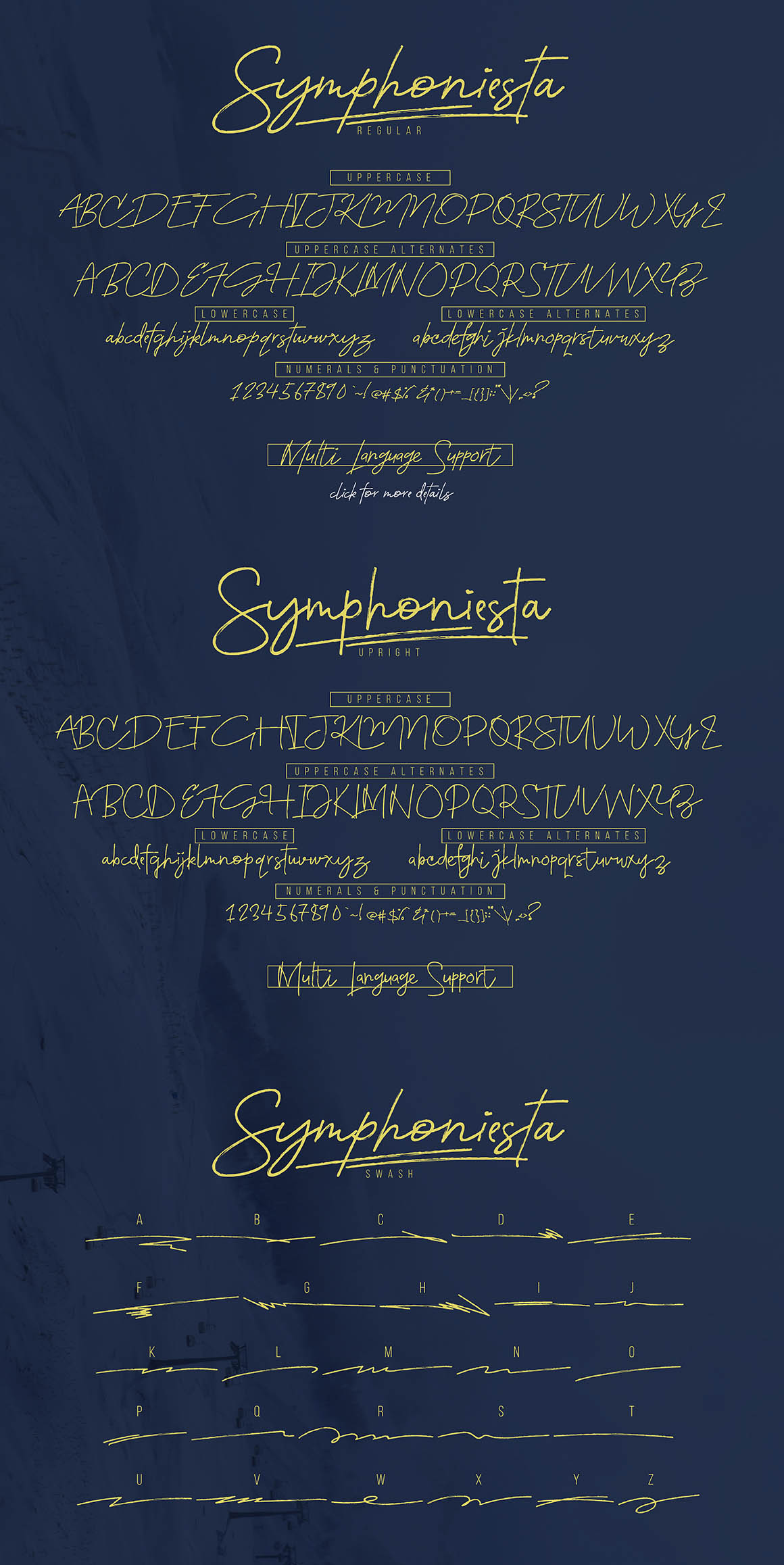 Symphoniesta Brushtype is a script font that helps you to create logos, signatures, and all things of course. Christmas, autumn, and winter is the inspiration. Symphoniesta had two families, namely: Symphoniesta Regular, and Symphoniesta Upright. In addition, the font is also equipped with a swash which will add to the aesthetics of your design.