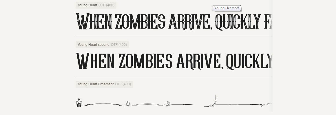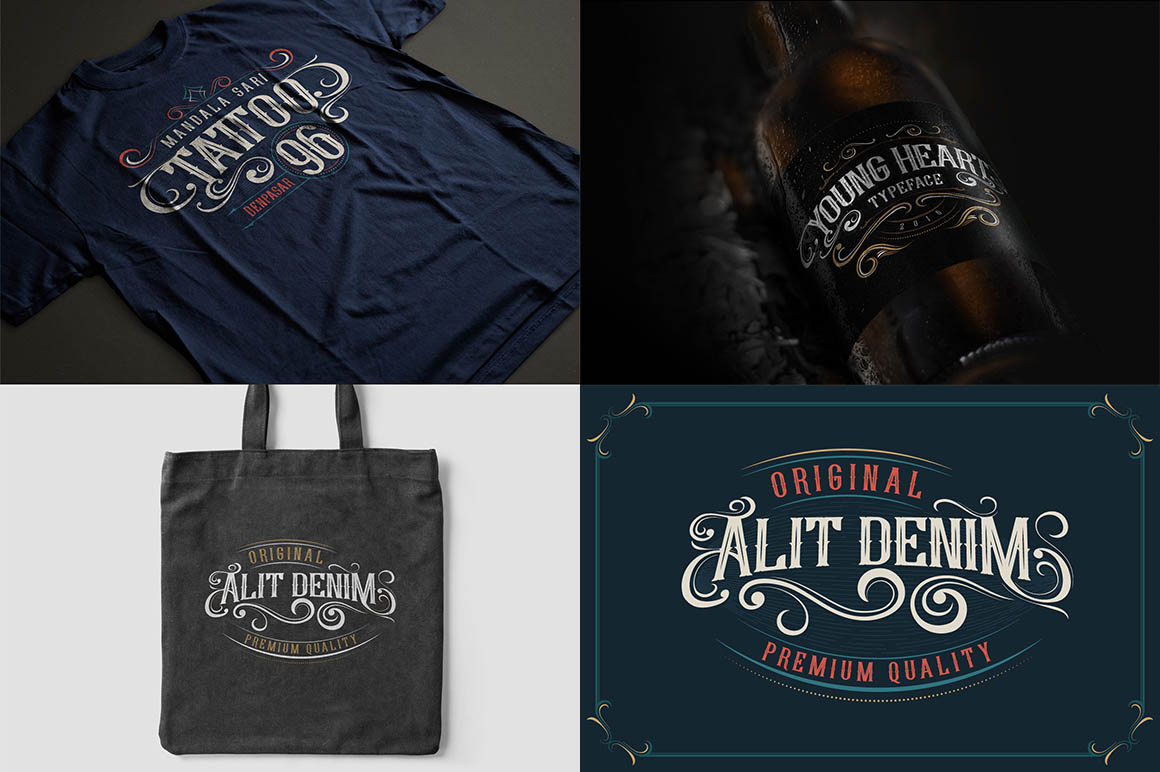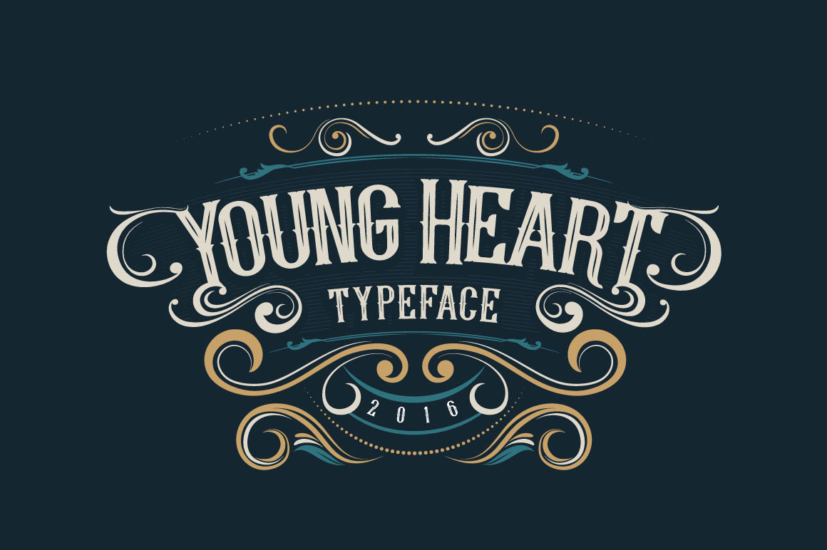 Introducing Young Heart Typeface western style display font. OpenType features with Stylistic Alternates. To access the alternate glyphs, you need a program that supports OpenType features such as Adobe Illustrator CS and Adobe Indesign. You can use this font for various purposes. such as logo, t-shirt, posters, lable, letterhead, book cover and etc.