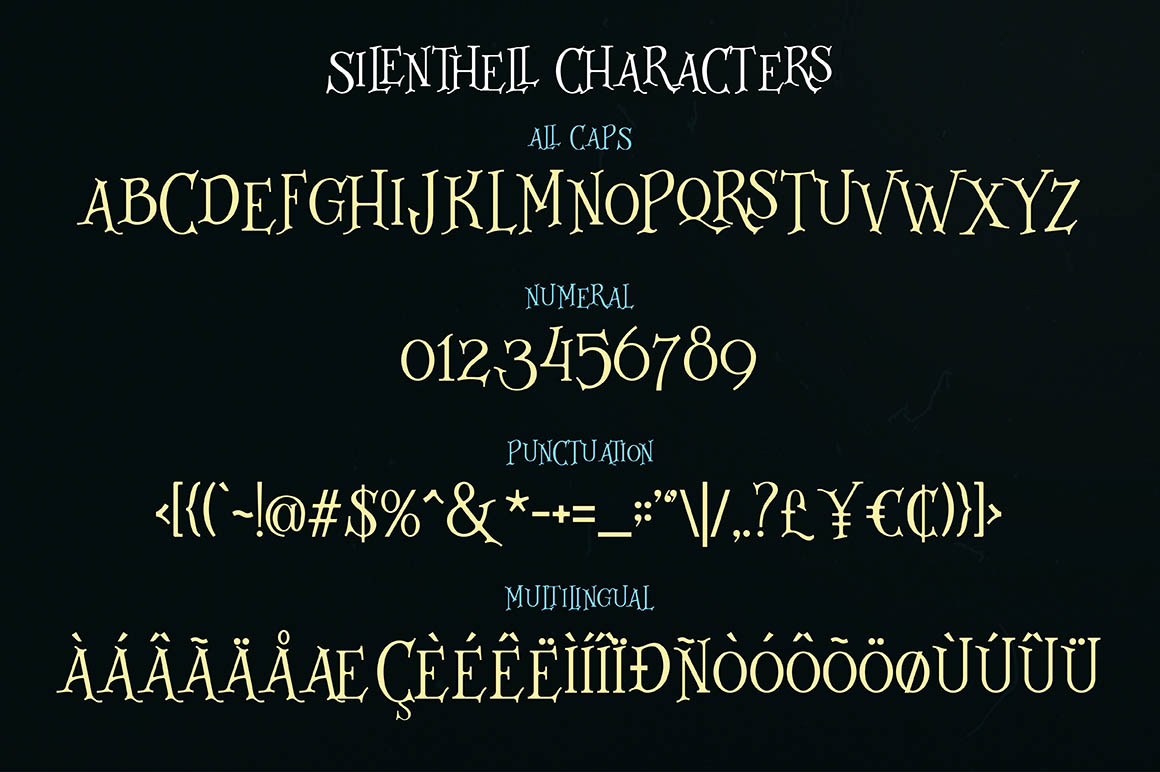 Silenthell is a font that inspired from vintage typography seen on movie posters, book covers, and flyers . Silenthell is a font for you that will make a poster design , illustration , banners , book covers and others . You will get a bonus : chatch words , Graphic Packs and Poster Design.