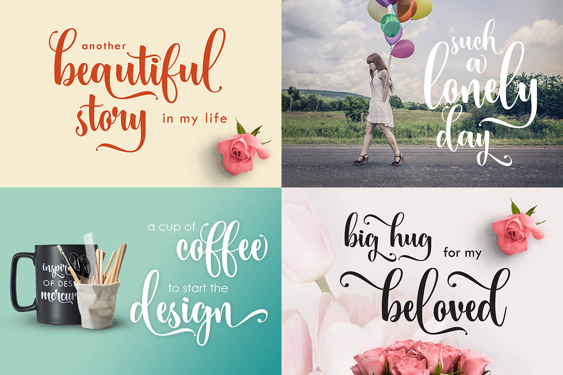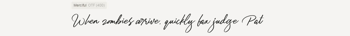 Introducing Merciful Script – a new fresh & modern script with a sweet calligraphy-style, decorative characters! Perfect for logo marks, typographic quotes over photos, book covers and packaging design, and more! Merciful come with 276 glyphs. The alternative characters were divided into several OpenType features such as Swash, Stylistic Sets, and Ligature. The OpenType features can be accessed by using OpenType savvy programs such as Adobe Illustrator and Adobe InDesign. The subset of Merciful Regular in this kit supports the following languages: Albanian, Basque, Breton, Chamorro, Danish, Dutch, English, Faroese, Finnish, French, Frisian, Galician, Italian, Malagasy, Norwegian, Portuguese, Swedish