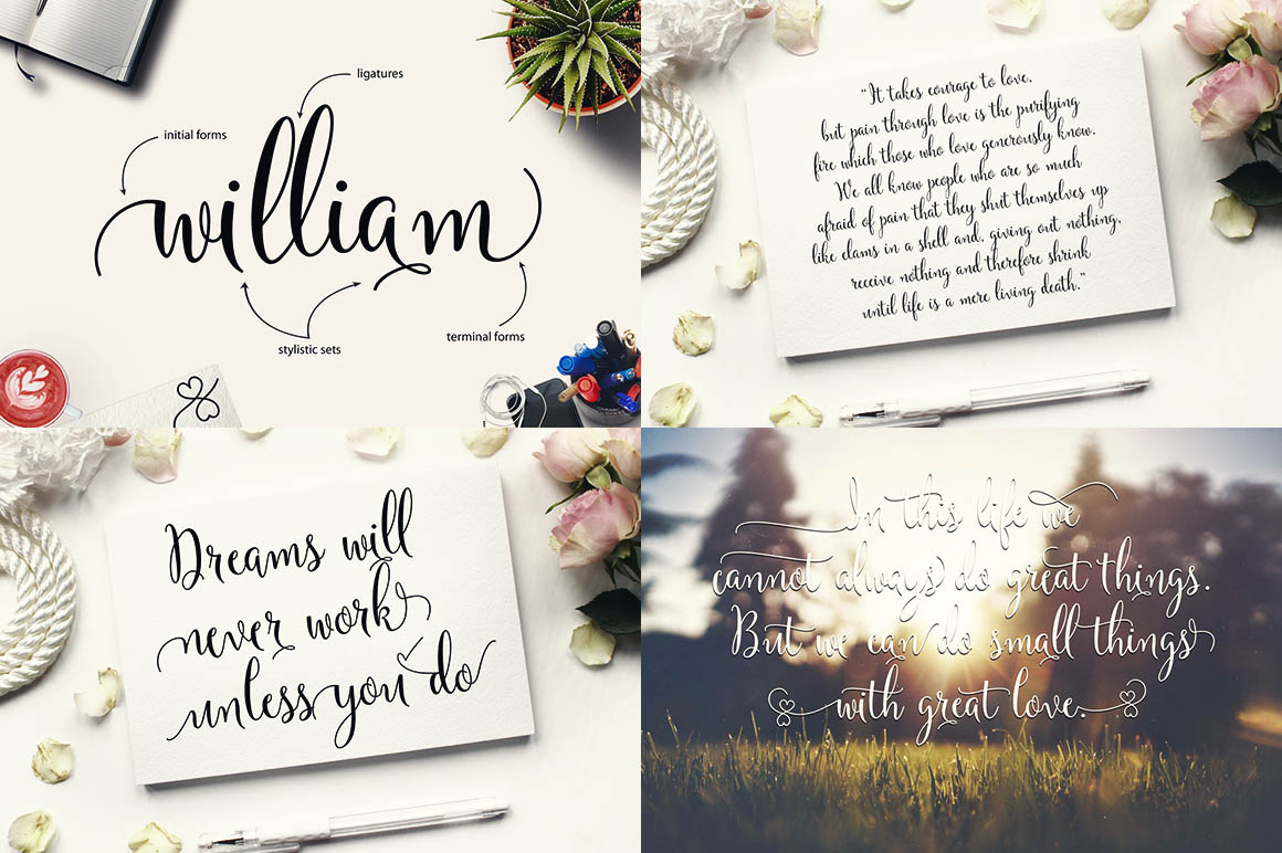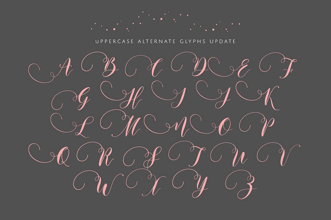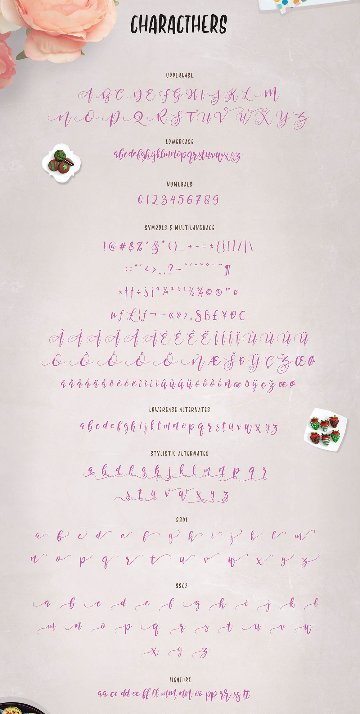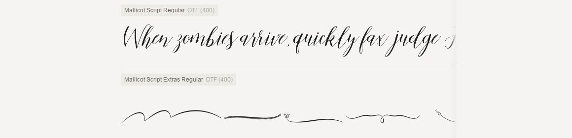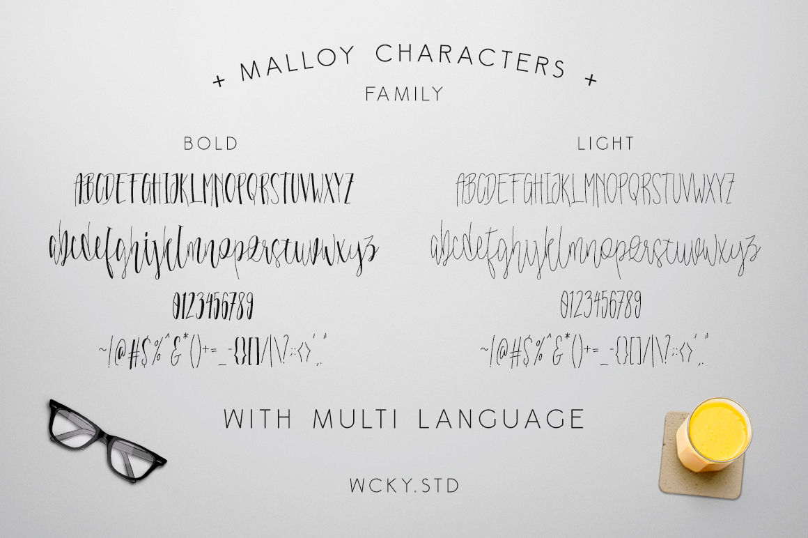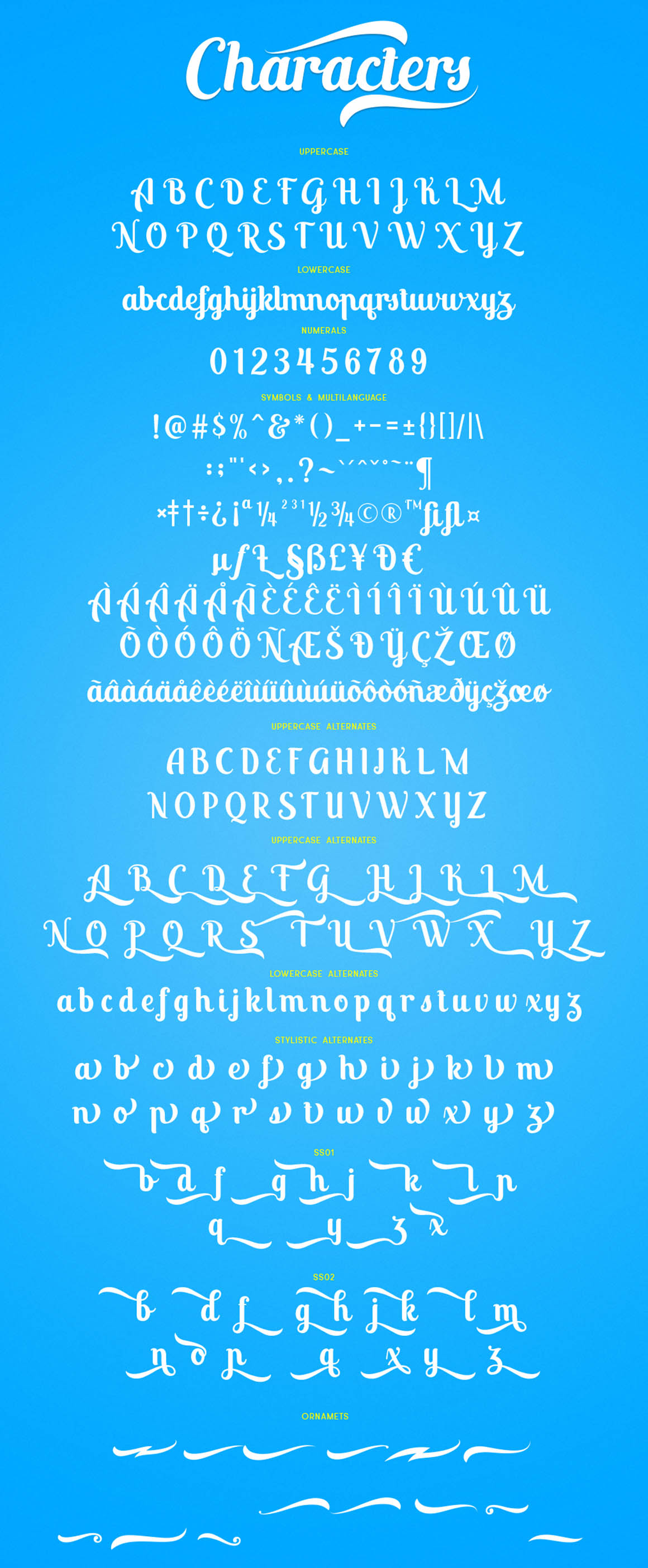Mallicot Script + Extras is a calligraphic manuscript modern, dynamic and pretty with swashes. Can be used for many purposes. such as title, signature, logo, wedding invitations, letterhead, signage, labels, newsletters, posters, badges, etc. Mallicot Script features Open type, including the initial and terminal letters, ligatures and International support for most Western languages included.