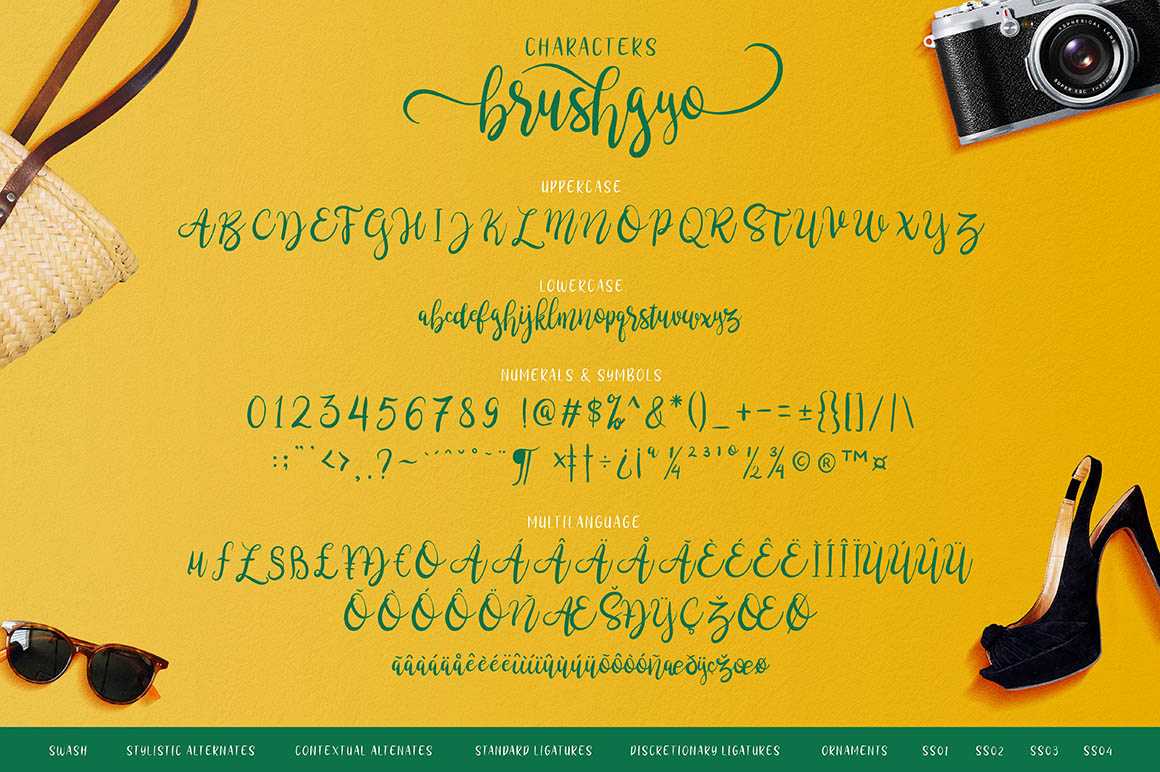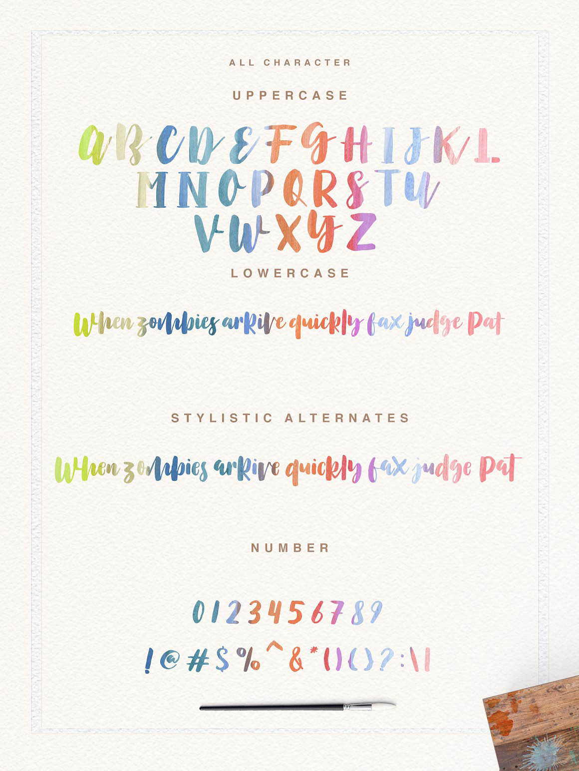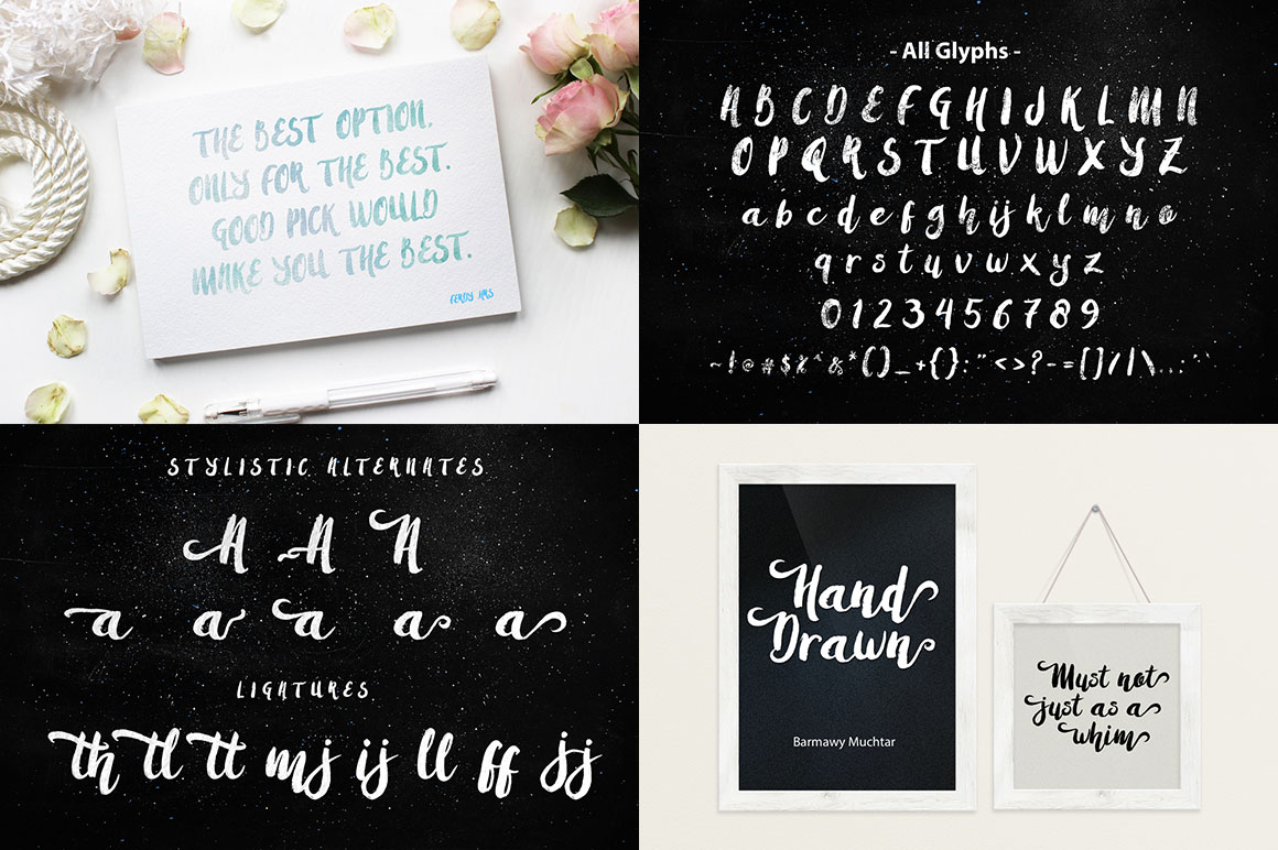 Brownie is a handlettering typeface with a brush style, it’s perfect for latterhead, apparel design, headline, logotype, poster, card, and etc. For folks who have opentype capable software : The alternates are accessible by turning on ‘Stylistic Alternates’ and ‘Ligatures’ buttons on in Photoshop’s Character panel, or via any software with a glyphs panel, e.g. Adobe Illustrator, Photoshop, Inkscape.