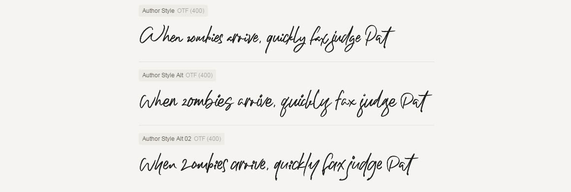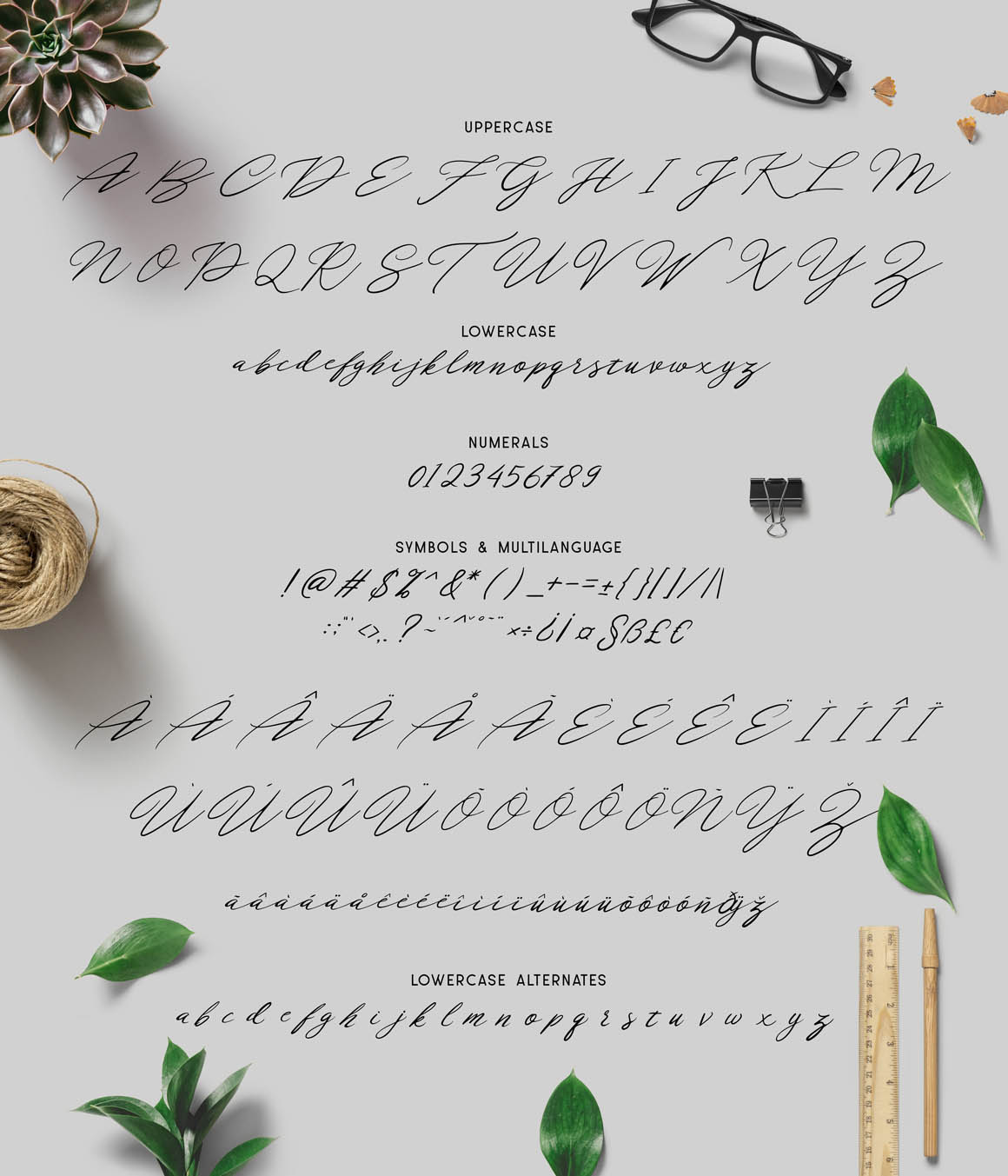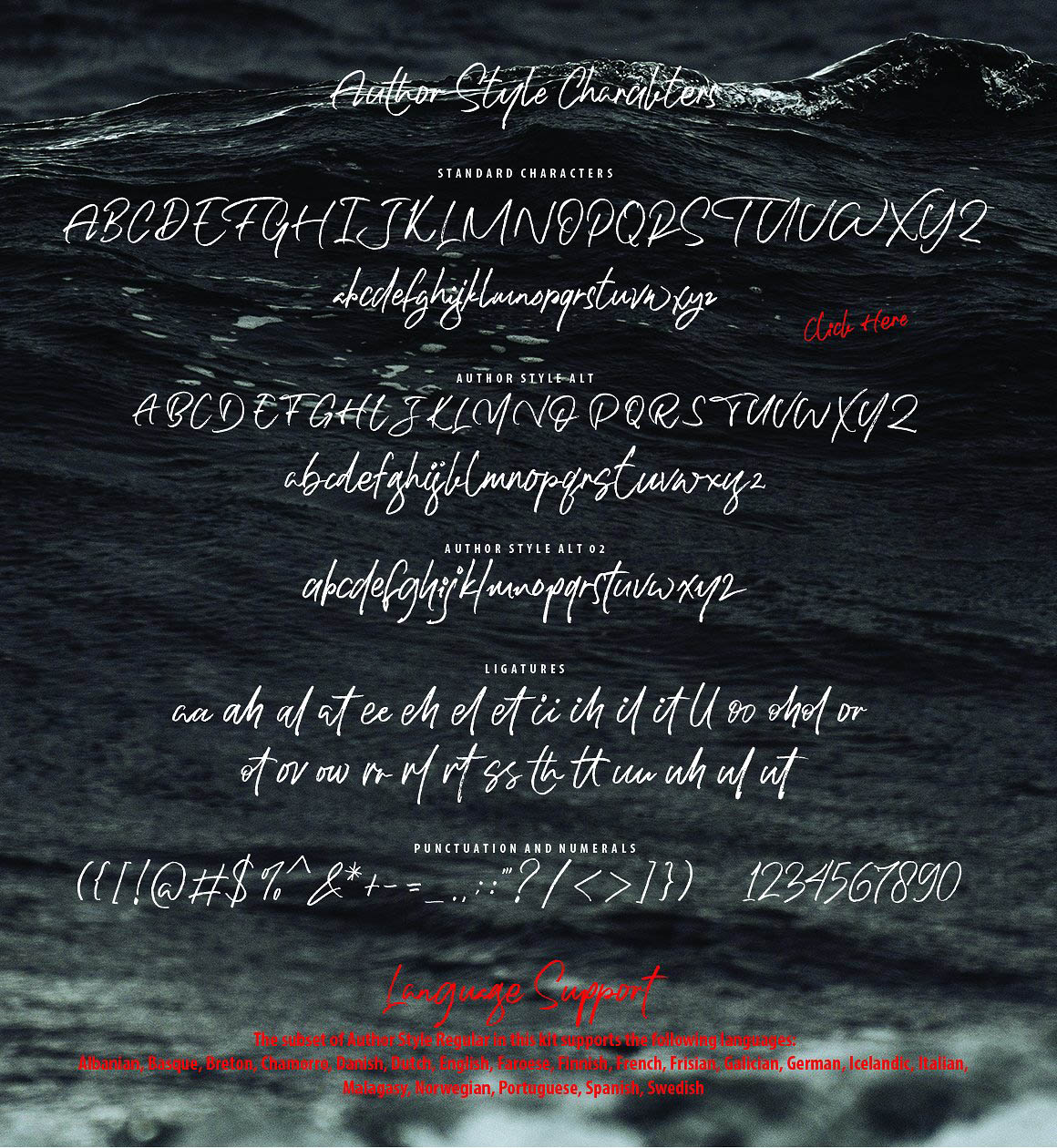 Author Style are handmade with amazing character. Ideal for a logo, a name tag, handwritten quotations, product packaging, goods, social media and greeting cards. It contains a complete set of lower and upper case letters, assorted punctuation, numbers, swash and multilingual support. The font also contains several ligatures and contextual alternates for lower case characters, accessible in the Adobe Illustrator Glyphs panel, or under Stylistic Alternates in the Adobe Photoshop OpenType menu. But If you don’t have any opentype specific software, you can still use Author Style as is with its standard lowercase and uppercase letters.