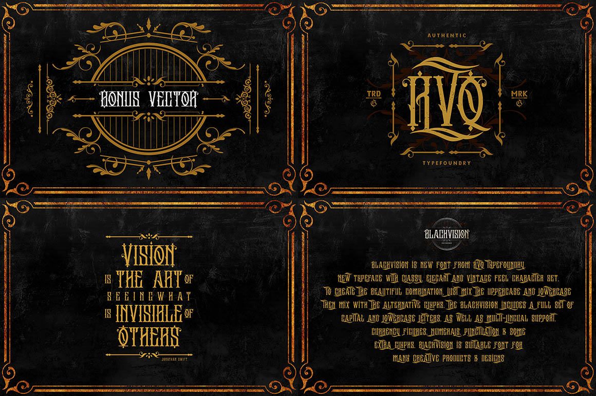 Black vision is new font from Rvq Typefoundry with classy, elegant and vintage feel character set. To create the beautiful combination, just mix the uppercase and lowercase then mix with the alternative glyphs. The Black vision includes a full set of capital and lowercase letters, as well as multi-lingual support, currency figures, numerals, punctuation & some extra glyphs.