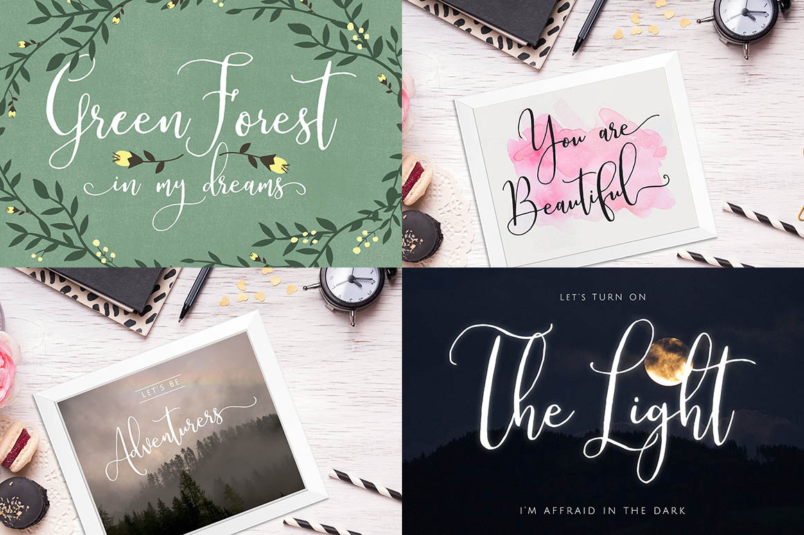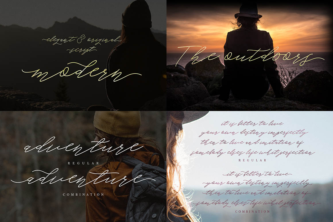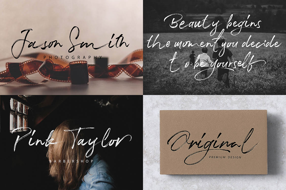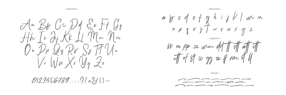 Justmine font inspired from combination handmade and modern script calligraphy. I just wanted to combine a few touches of the previous font. Justmine is perfect for branding projects, logotype, product packaging, text for title or simply as a stylish text overlay to any background image. Justmine is a script font with 521 glyphs. Justmine is equipped with some of OpenType features: To activate the alternates click on Swash, and Stylistic Alternates in any OpenType savvy program or manually select the characters from Glyph Palette.