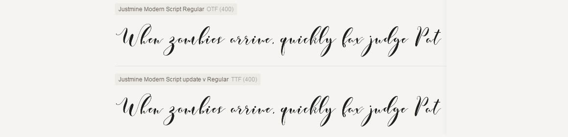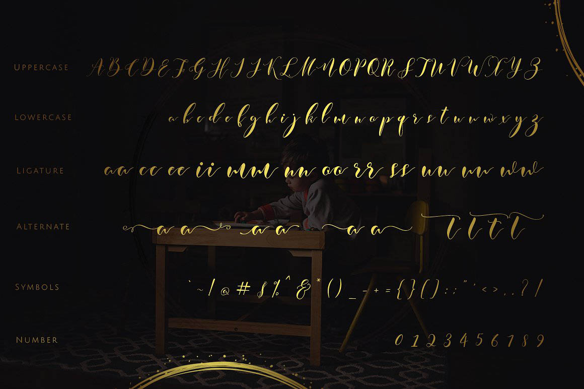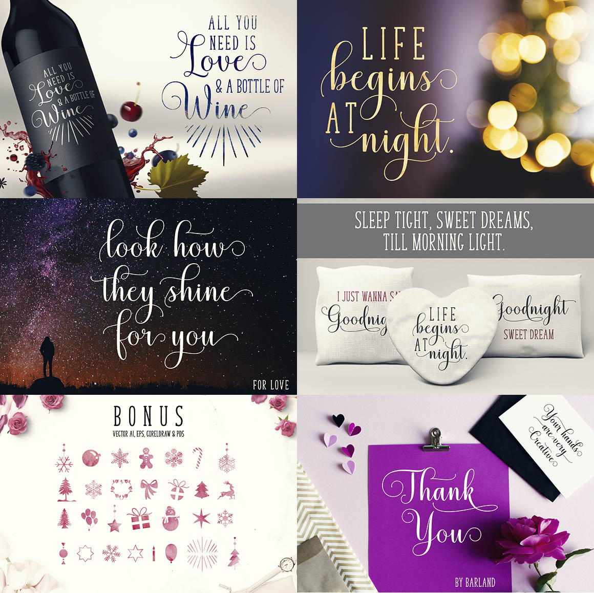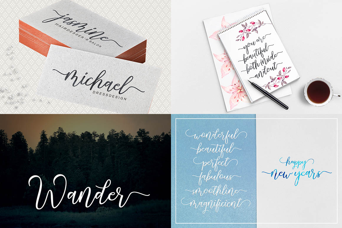 Justmine font inspired from combination handmade and modern script calligraphy. I just wanted to combine a few touches of the previous font. Justmine is perfect for branding projects, logotype, product packaging, text for title or simply as a stylish text overlay to any background image. Justmine is a script font with 521 glyphs. Justmine is equipped with some of OpenType features: To activate the alternates click on Swash, and Stylistic Alternates in any OpenType savvy program or manually select the characters from Glyph Palette.