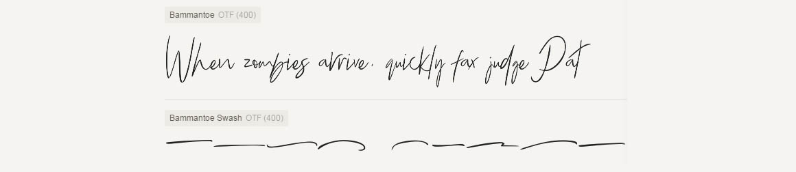 Introducing: Bammantoe Typeface is a handwritten font. The style of handwriting and irregular but still elegant, and you will enjoy to use this font style. Bammantoe is perfect for branding projects, homeware designs, product packaging – or simply as a stylish text overlay to any background image. Fonts are provided in TTF & OTF formats. I recommend installing the TTF files, and the OTF only if necessary. There is no difference in function with either format. Ligatures • Are also available for several lowercase characters (double-letters which flow more naturally). These are only accessible via software with opentype capability or a glyphs panel, e.g. Photoshop/Illustrator.