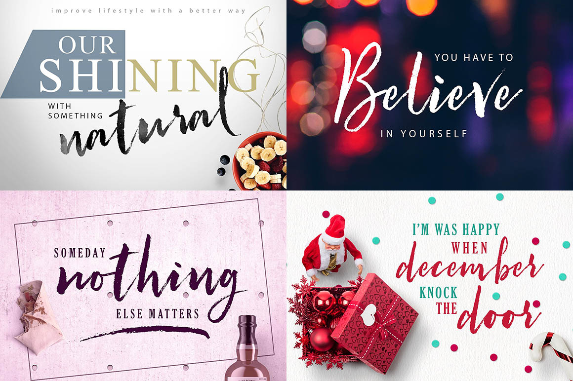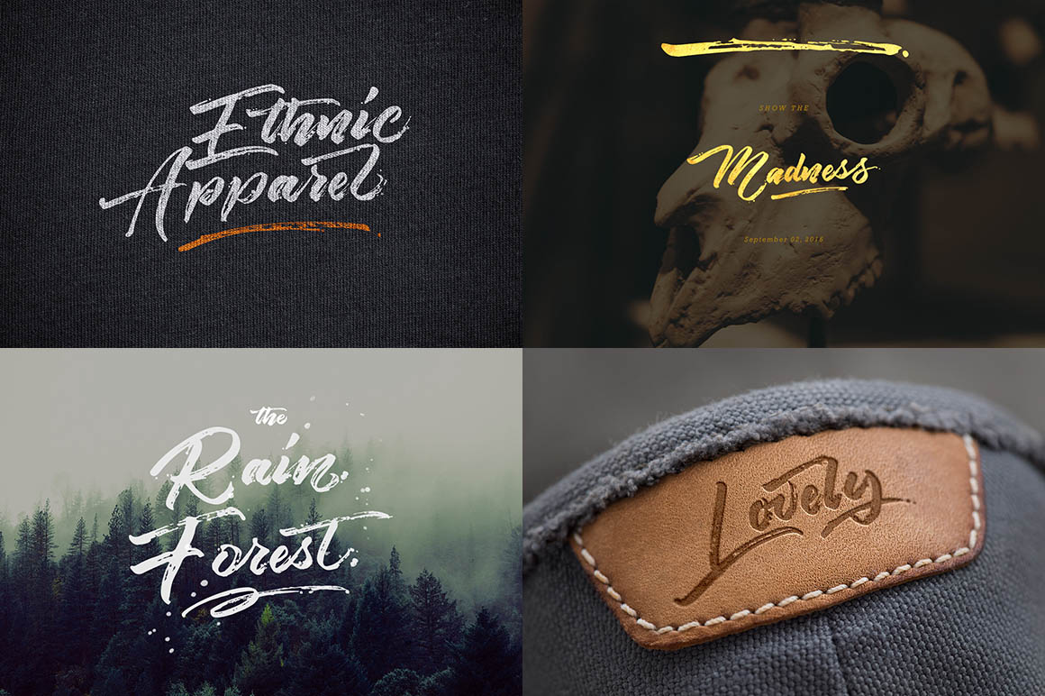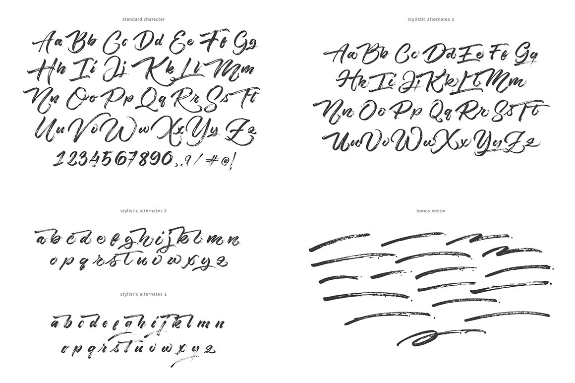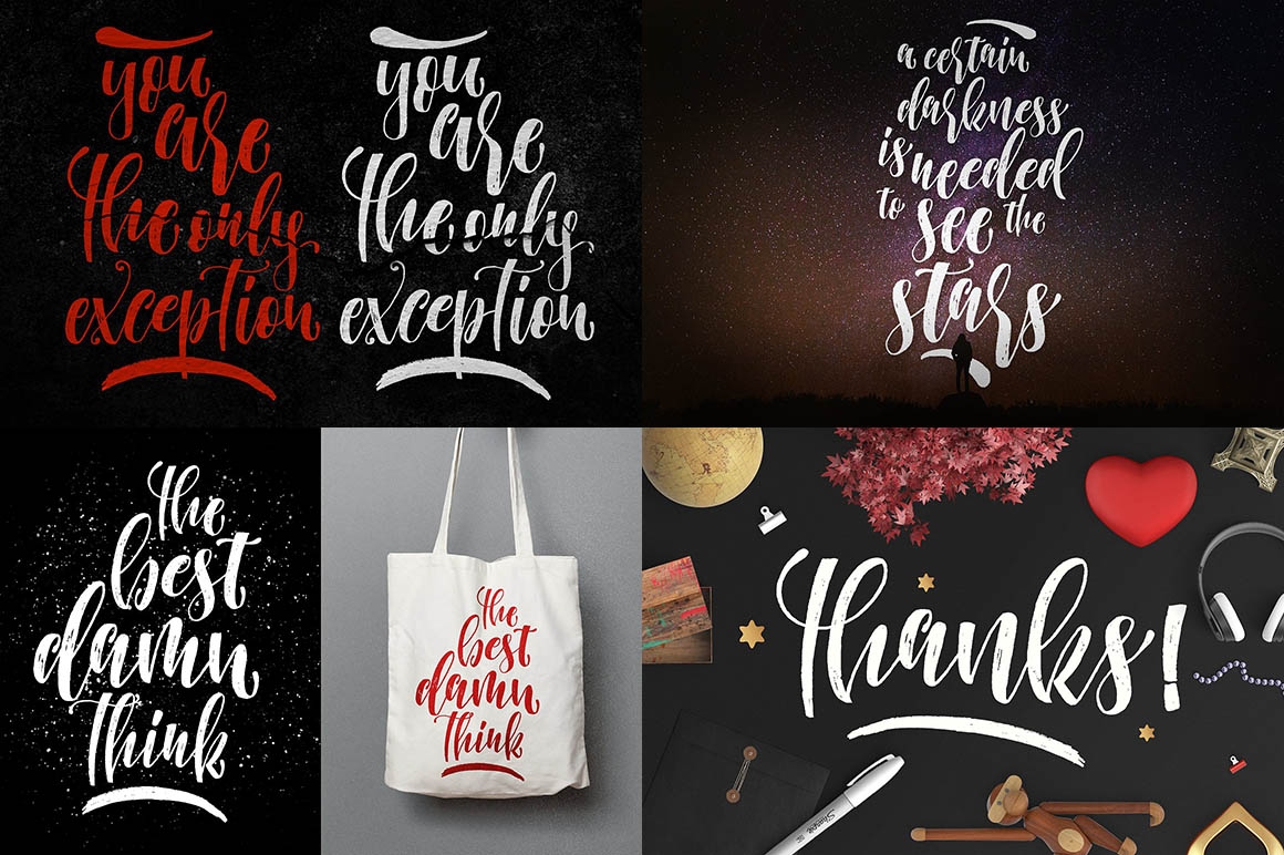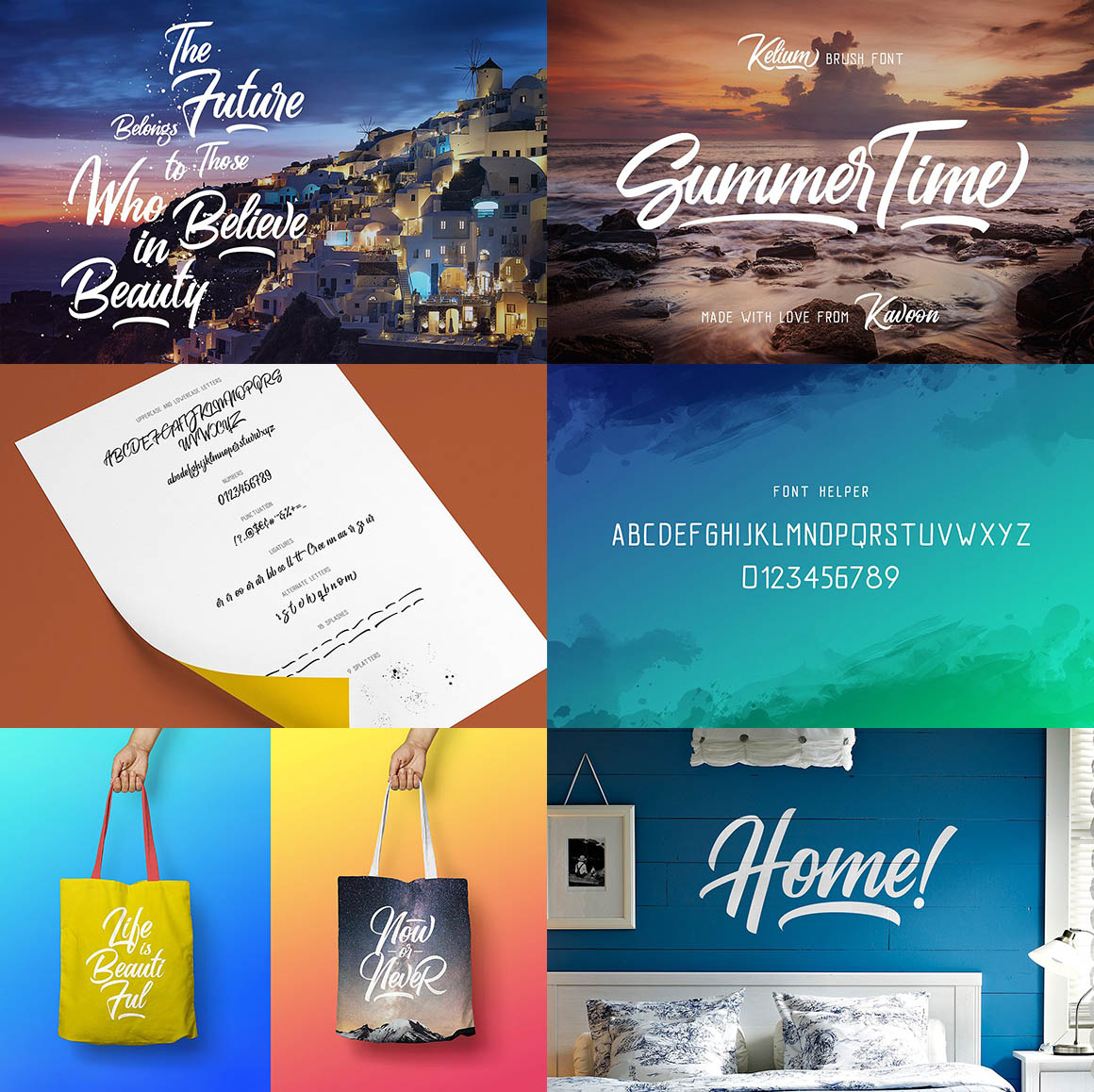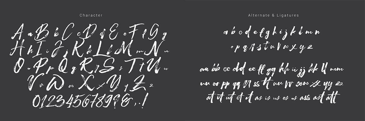 Kelium is a handlettering typeface with a brush style, it’s perfect for latterhead, apparel design, headline, logotype, poster, card, and etc. For folks who have opentype capable software : The alternates are accessible by turning on ‘Stylistic Alternates’ and ‘Ligatures’ buttons on in Photoshop’s Character panel, or via any software with a glyphs panel, e.g. Adobe Illustrator, Photoshop, Inkscape.