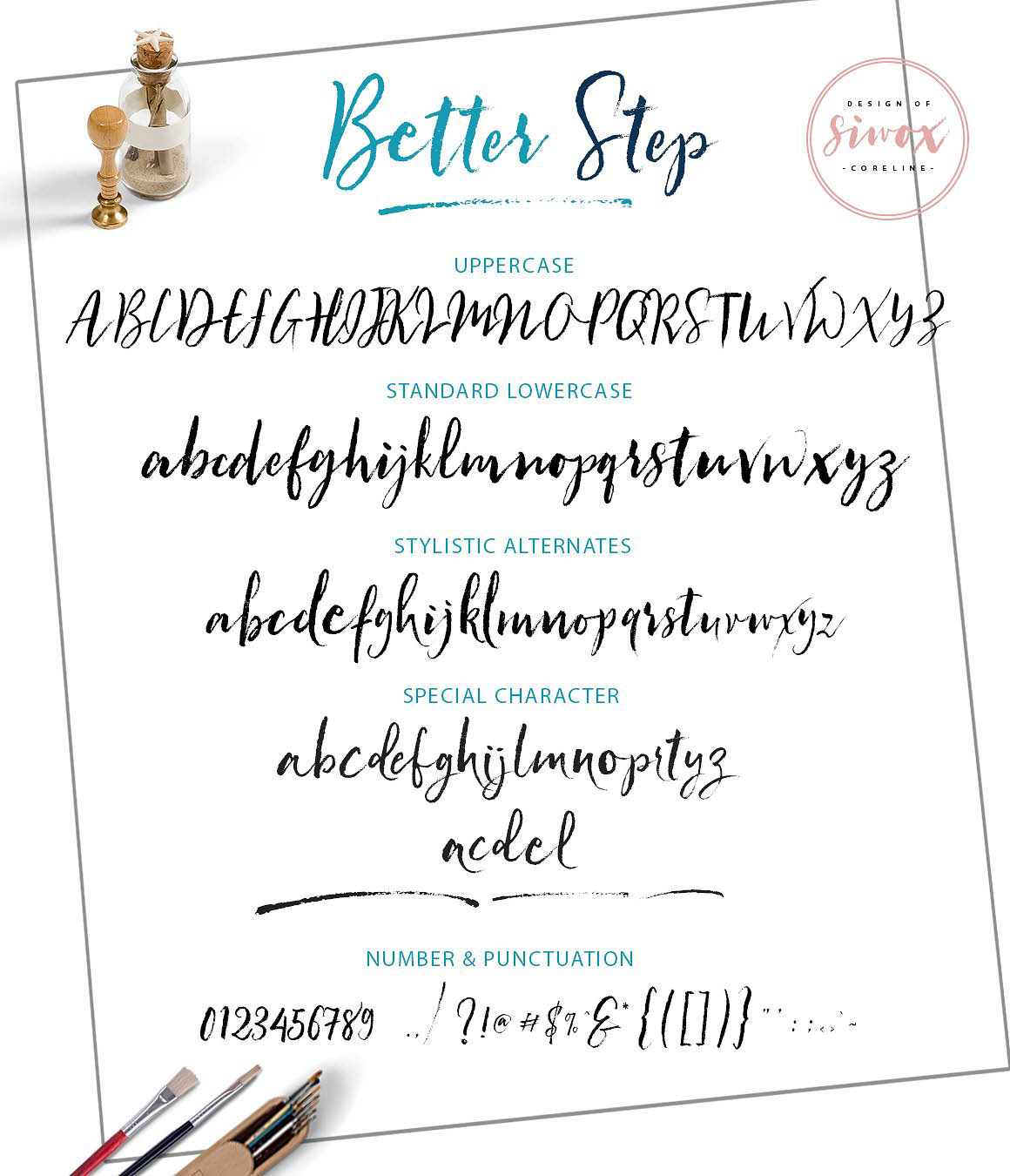 Better Step is a handmade style font with stunning characters. Made with a brush and high quality water-based ink. Ideal for name tag, handwritten quotes, product packaging, merchandise, social media, greeting cards, etc. It contains a full set of lower & uppercase letters, a large range of punctuation, numerals. Full accessible in the Adobe Illustrator Glyphs panel, or under Stylistic Alternates in the Adobe Photoshop OpenType menu. Corel, Ms. Word, Ms. Powerpoint, etc. No special software is required to access any of the standard letters.