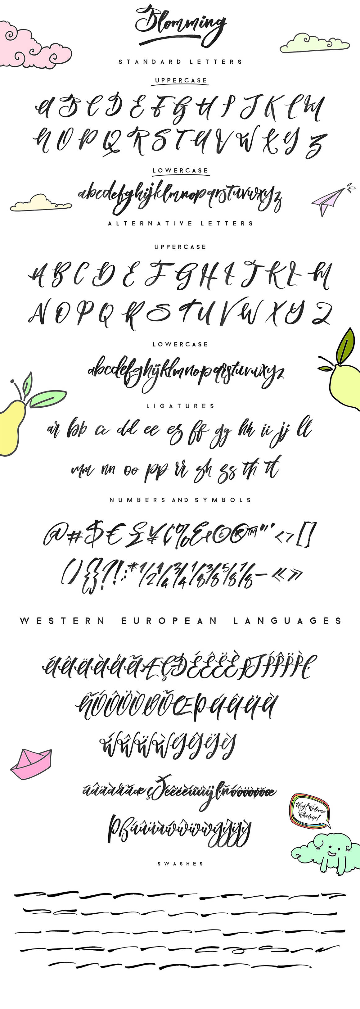 This is made by quick brush strokes new designed font and with lower and uppercase. Besides great swashes free!Moreover included extra upper and lowercases.By the way Blomming Typefas has ligatures, you can find Glyph Panel or Character Map. That’s a perfect font file for make minimal logo designs.! Situations statement telling words looking awesome with swashes.(Etc. Congratulation, Happy Birtday, I love you…)
